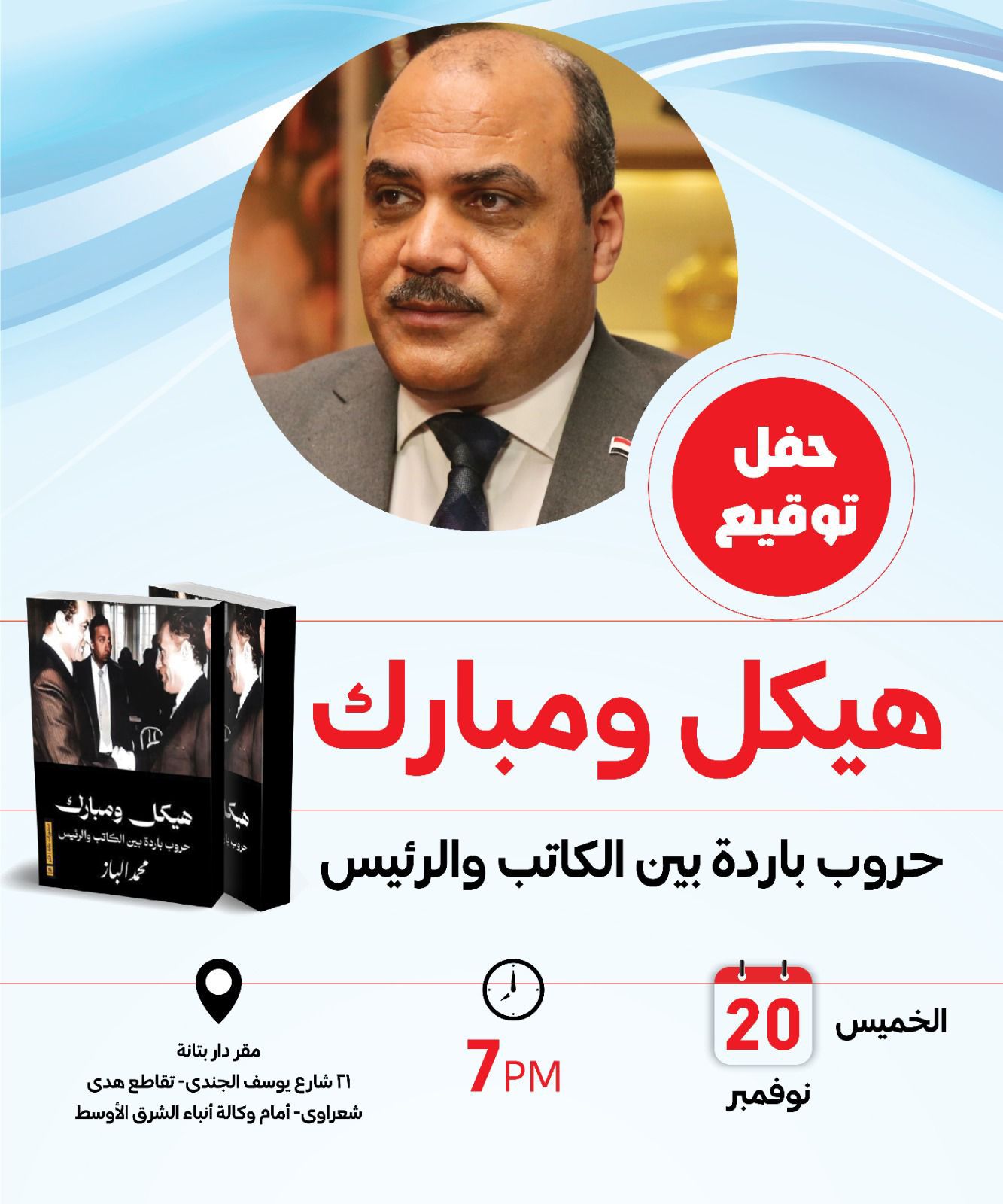 نظمت دار بتانة للنشر والتوزيع، اليوم الخميس 20 نوفمبر حفل توقيع كتاب «هيكل ومبارك: حروب باردة بين الكاتب والرئيس»، للكاتب الصحفى الدكتور محمد الباز، رئيس مجلس إدارة جريدة الدستور، وذلك في الساعة السابعة مساءً بمقر الدار في وسط البلد.