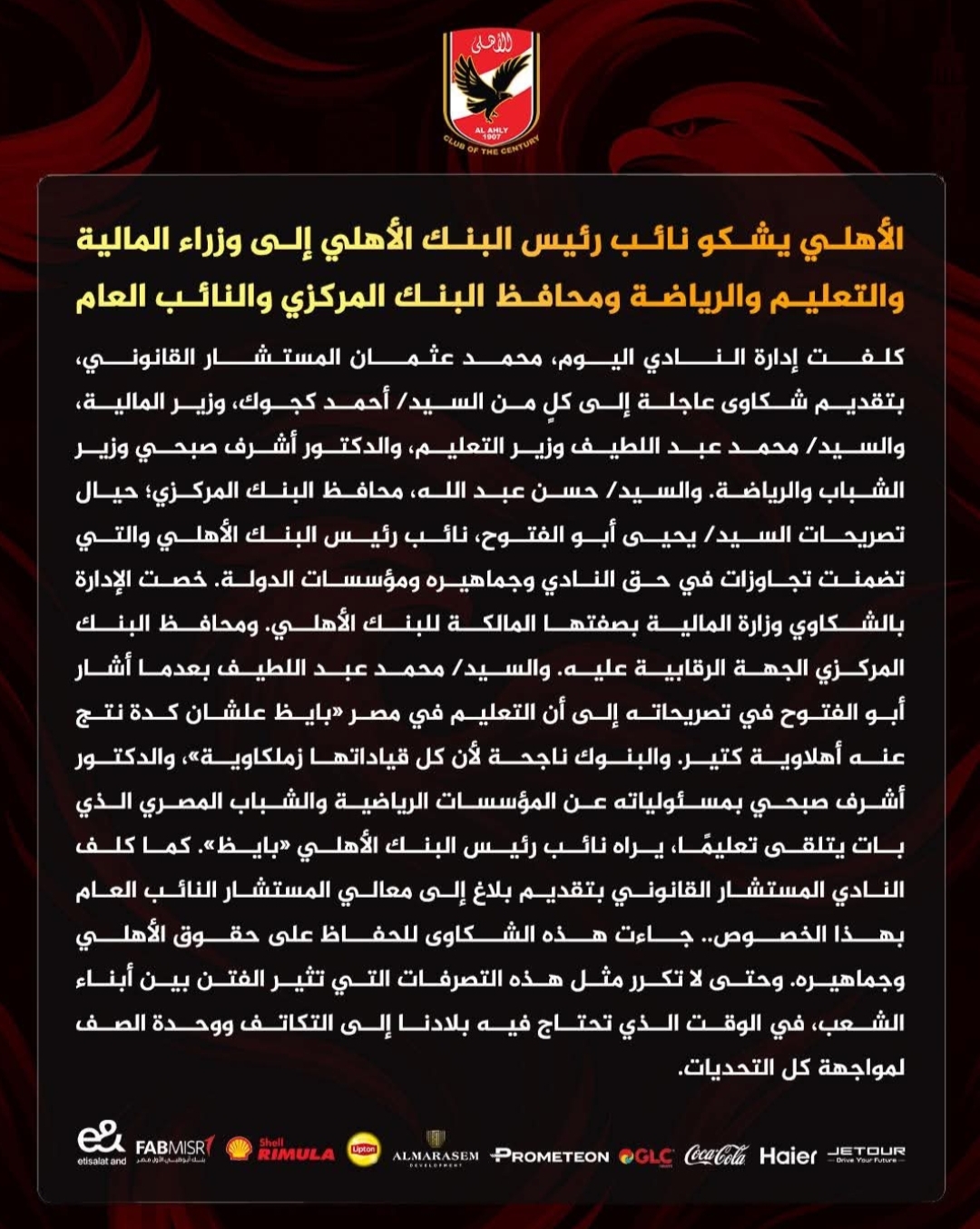 الأهلي يشكو نائب رئيس البنك الأهلي إلى وزراء المالية والتعليم والرياضة ومحافظ البنك المركزي والنائب العام