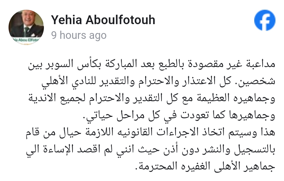 ونشرت الصفحة الرسمية الأهلي بيان جاء كالتالي: كلفت إدارة النادي اليوم، محمد عثمان المستشار القانوني بتقديم شكاوى عاجلة إلى كل من السيد / أحمد كجوك، وزير المالية والسيد/ محمد عبد اللطيف وزير التعليم، والدكتور أشرف صبحي وزير الشباب والرياضة. والسيد حسن عبد الله، محافظ البنك المركزي حيال تصريحات السيد/ يحيى أبو الفتوح، نائب رئيس البنك الأهلي والتي تضمنت تجاوزات في حق النادي وجماهيره ومؤسسات الدولة.