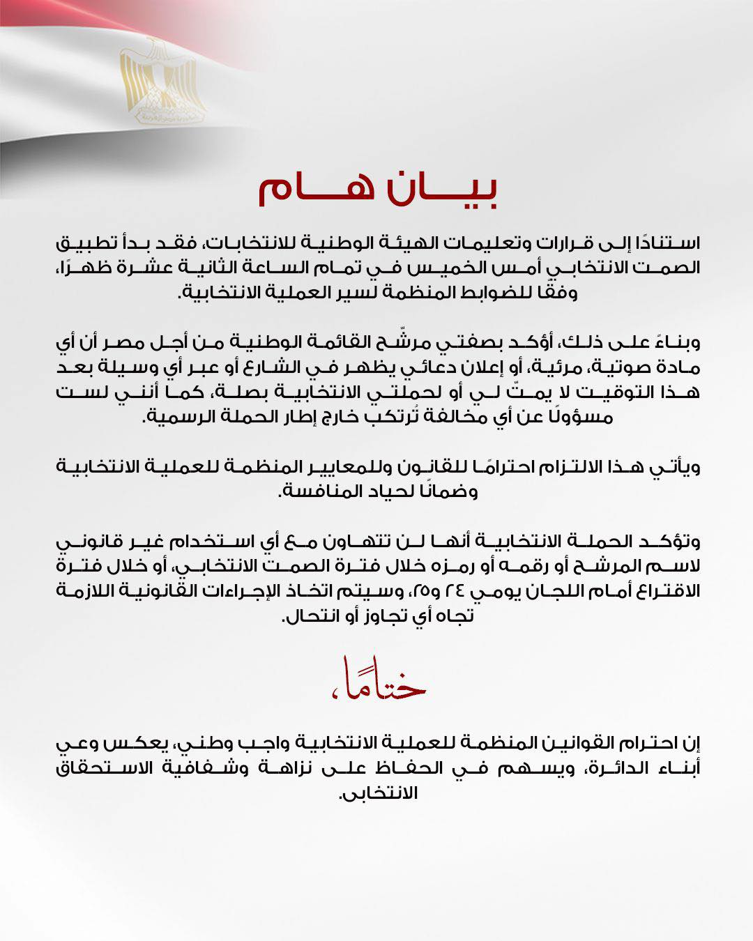 أصدر الدكتور السيد القصير الأمين العام لحزب الجبهة الوطنية والمرشح ضمن القائمة الوطنية من أجل مصر بالانتخابات مجلس النواب 2025 بيانا أكد فيه التزامه الكامل لتعليمات الهيئة الوطنية للانتخابات المتعلقة بالصمت الانتخابي وفترة الدعاية الانتخابية.