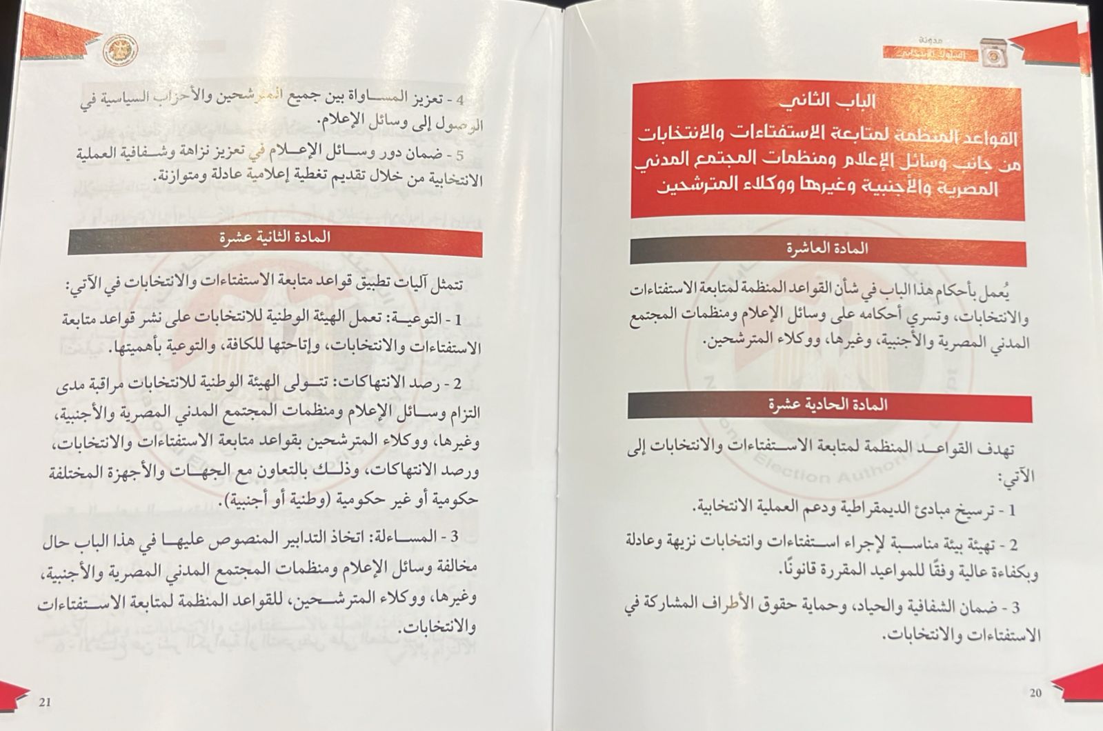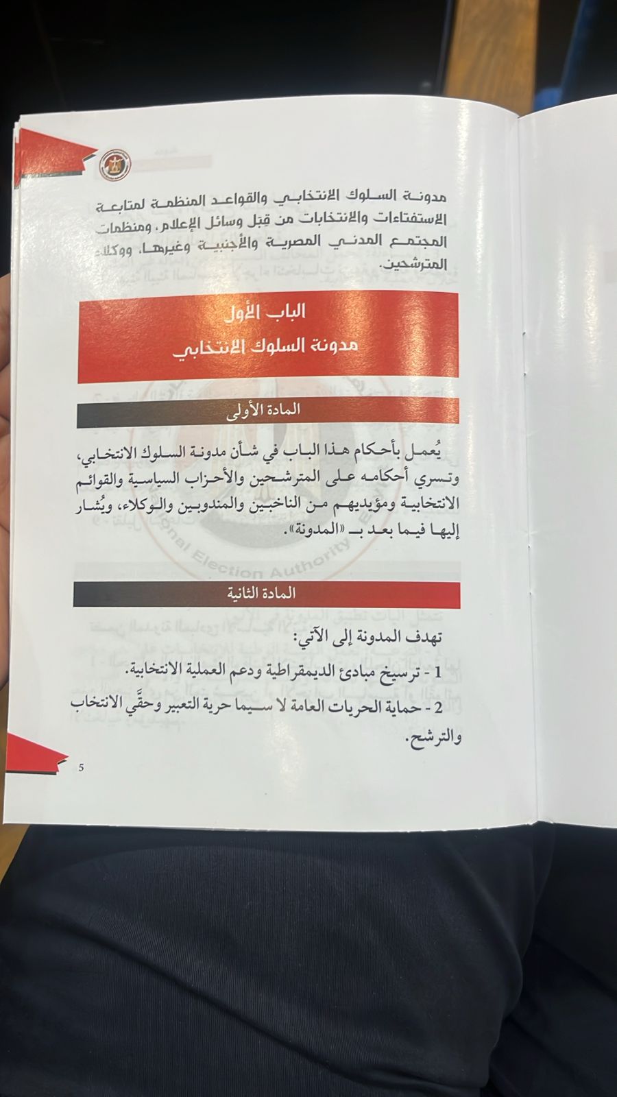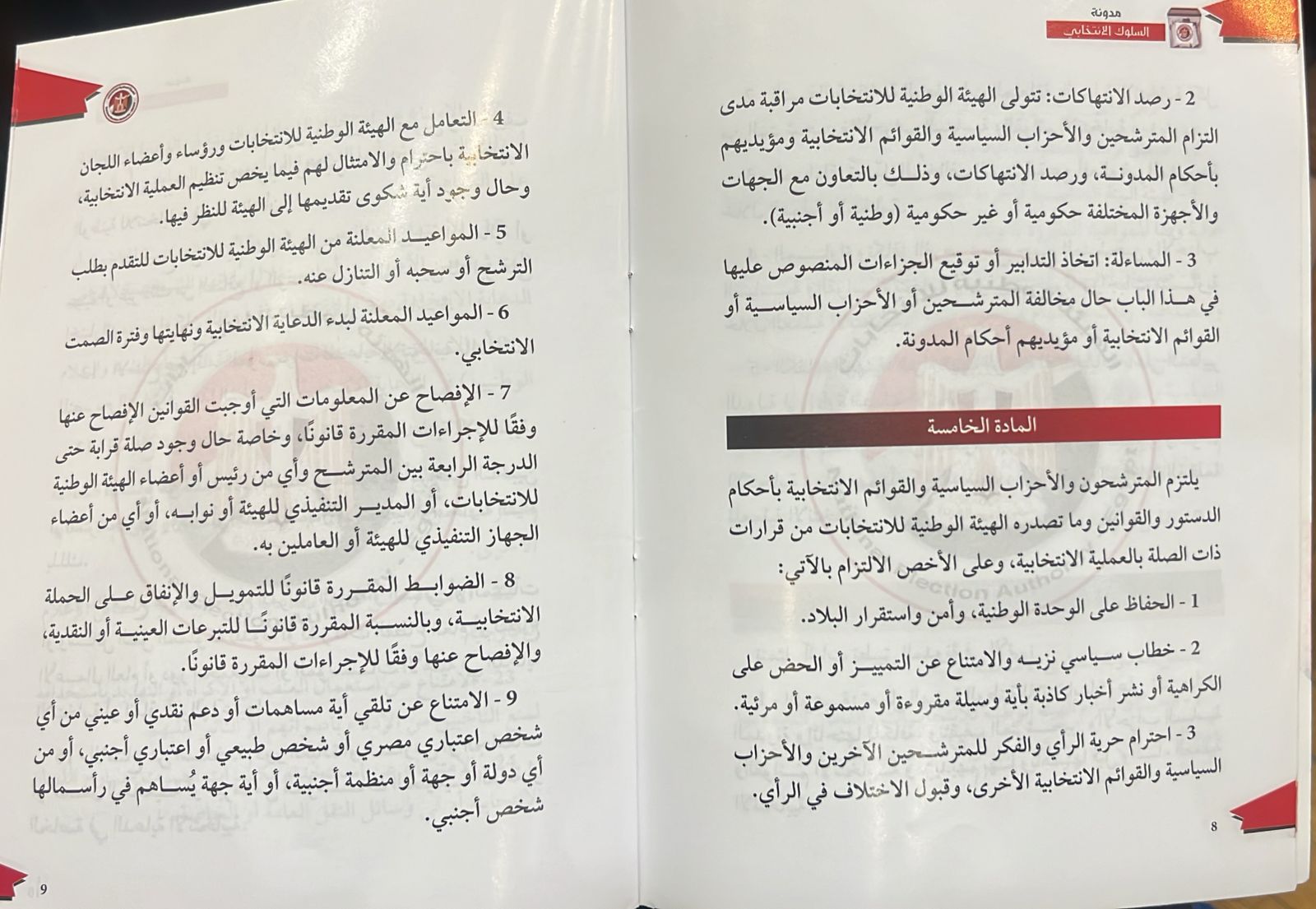 أصدرت الهيئة الوطنية للانتخابات مدونة السلوك الانتخابي التي تسري على جميع المرشحين والأحزاب السياسية والقوائم الانتخابية ومؤيديهم من الناخبين والمندوبين والوكلاء، في إطار استعدادات انتخابات مجلس النواب المقررة في الخارج يومي 7 و8 نوفمبر، وفي الداخل يومي 10 و11 نوفمبر، على أن تُعلن النتيجة الرسمية يوم 18 نوفمبر، مع استئناف الدعاية للمرحلة الثانية في اليوم نفسه.