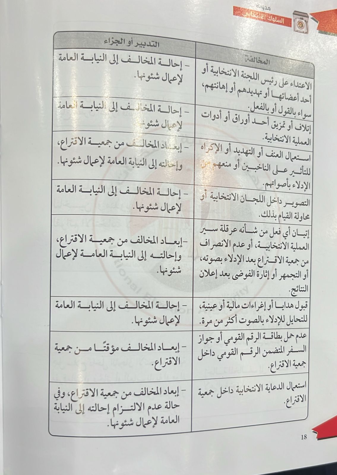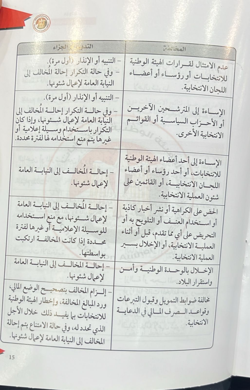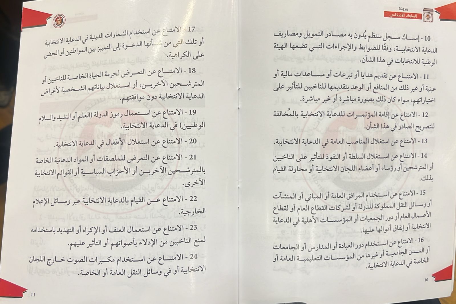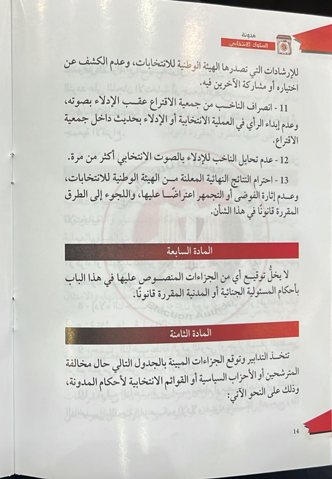 وأكدت الهيئة أيضًا ضوابط سلوك مؤيدي المرشحين داخل اللجان، والتي تشمل احترام النظام العام والآداب، حظر الدعاية أو تصوير بطاقات الاقتراع، والالتزام بالسرية في التصويت، مع التأكيد على احترام النتائج النهائية واللجوء إلى الطرق القانونية فقط في حال الاعتراض.