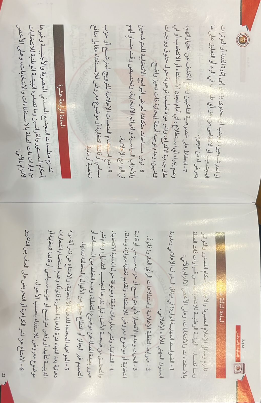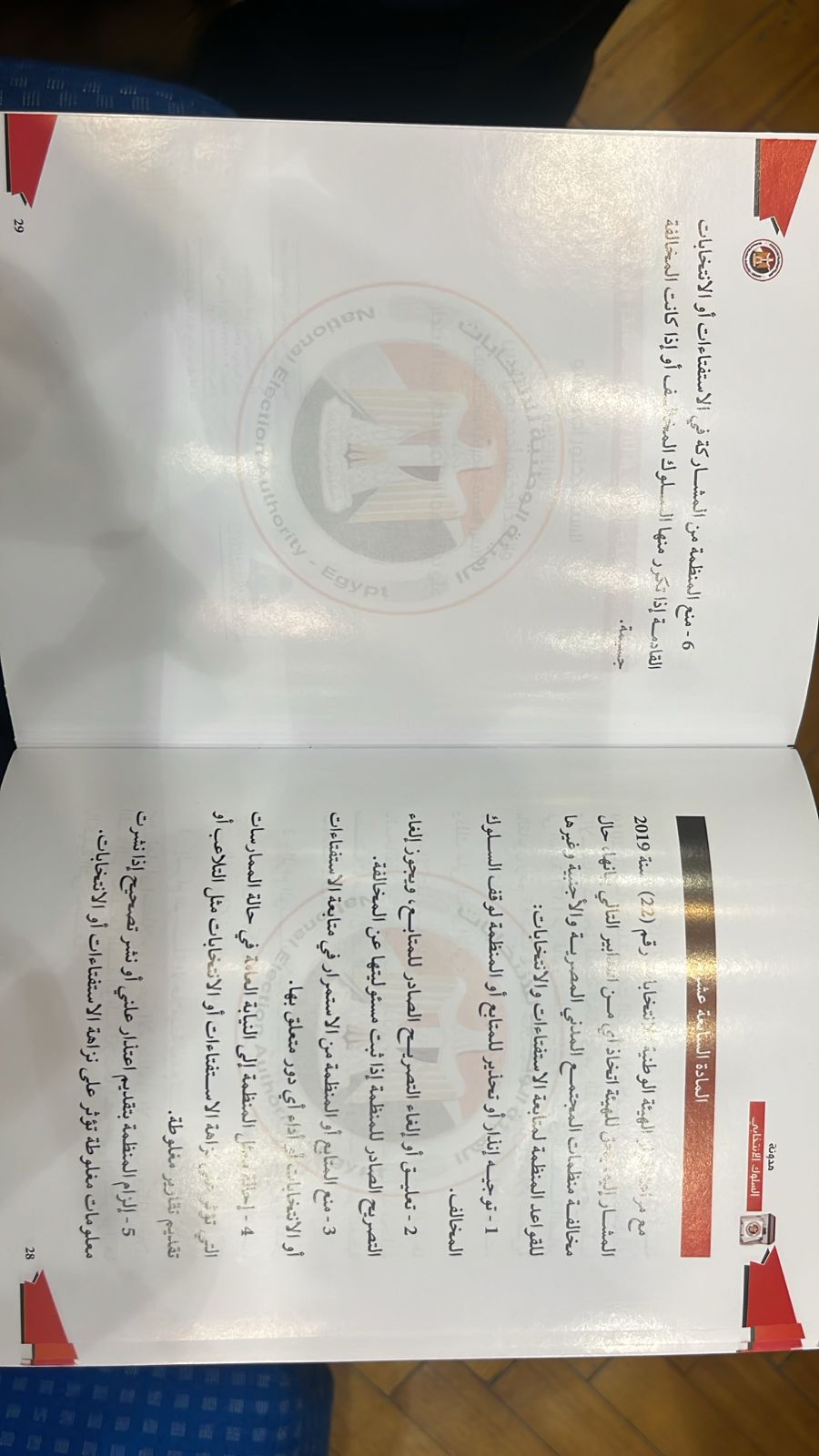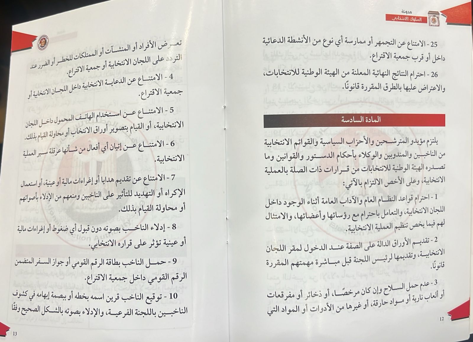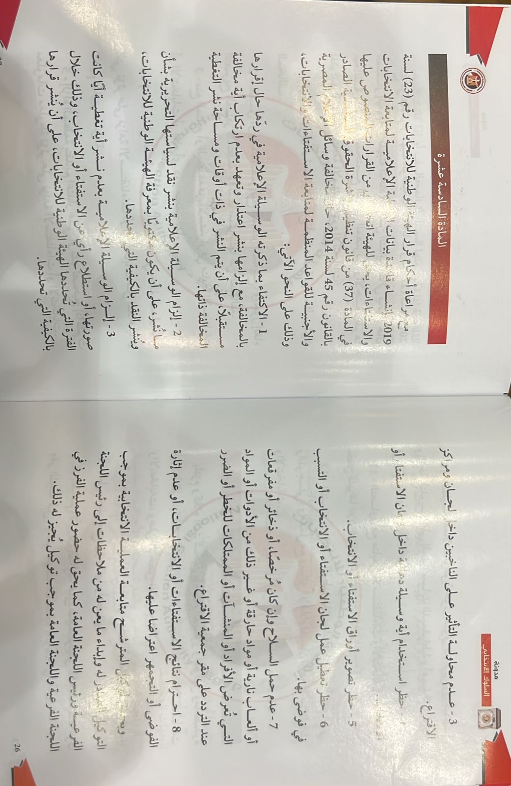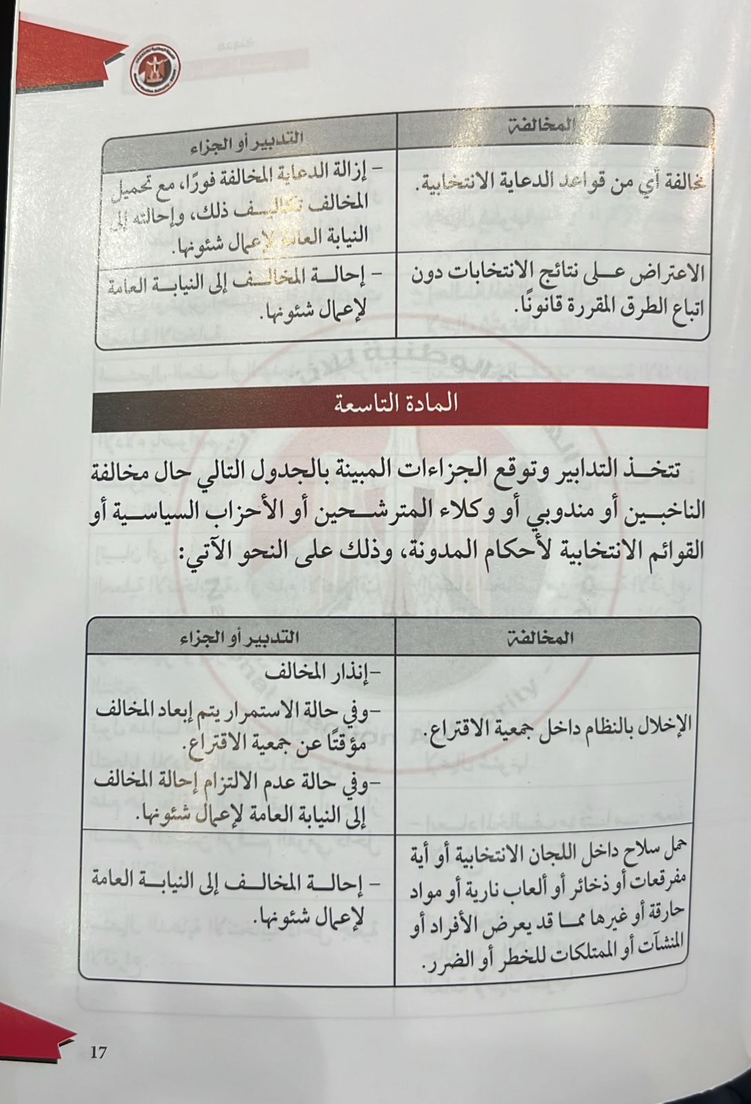 وأكدت الهيئة أيضًا ضوابط سلوك مؤيدي المرشحين داخل اللجان، والتي تشمل احترام النظام العام والآداب، حظر الدعاية أو تصوير بطاقات الاقتراع، والالتزام بالسرية في التصويت، مع التأكيد على احترام النتائج النهائية واللجوء إلى الطرق القانونية فقط في حال الاعتراض.