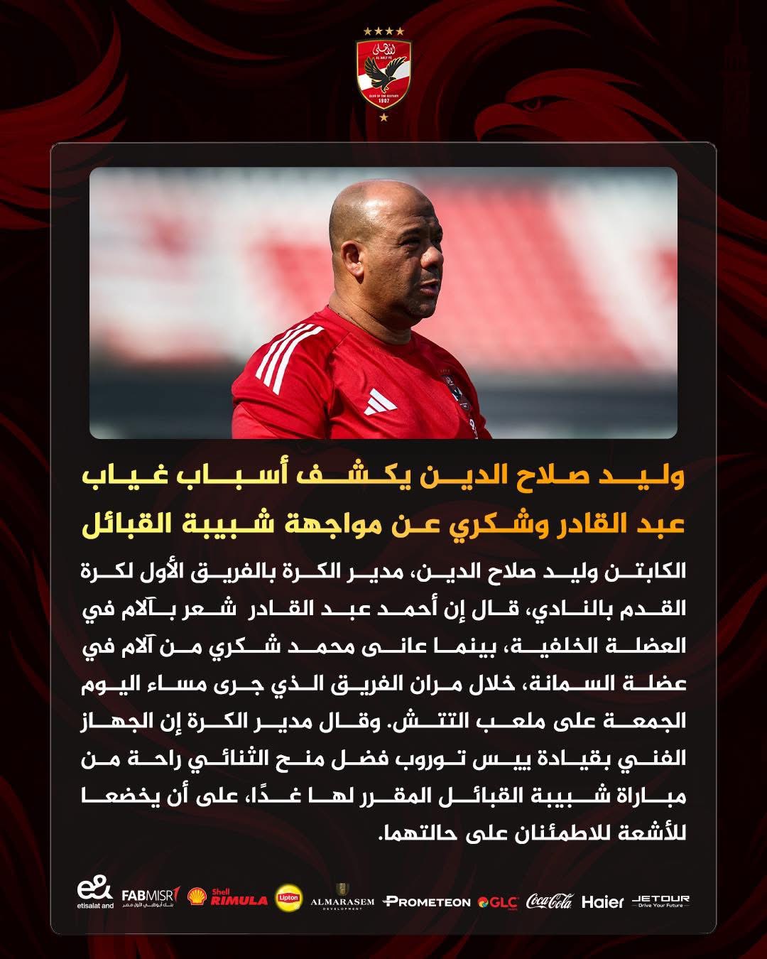 قال الكابتن وليد صلاح الدين، مدير الكرة بالفريق الأول لكرة القدم بالنادي الأهلي ، إن أحمد عبد القادر شعر بآلام في العضلة الخلفية، بينما عانى محمد شكري من آلام في عضلة السمانة، خلال مران الفريق الذي جرى مساء اليوم الجمعة على ملعب التتش.