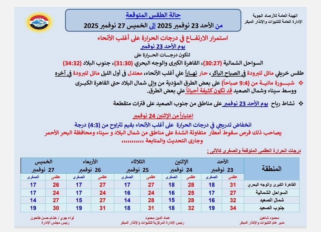 يقدم لكم موقع مصر تايمز التقرير التفصيلي الكامل حول التوقعات المناخية بداية من الأحد 23 نوفمبر 2025 وحتى الخميس 27 نوفمبر 2025، بحسب بيان هيئة الأرصاد الجوية.