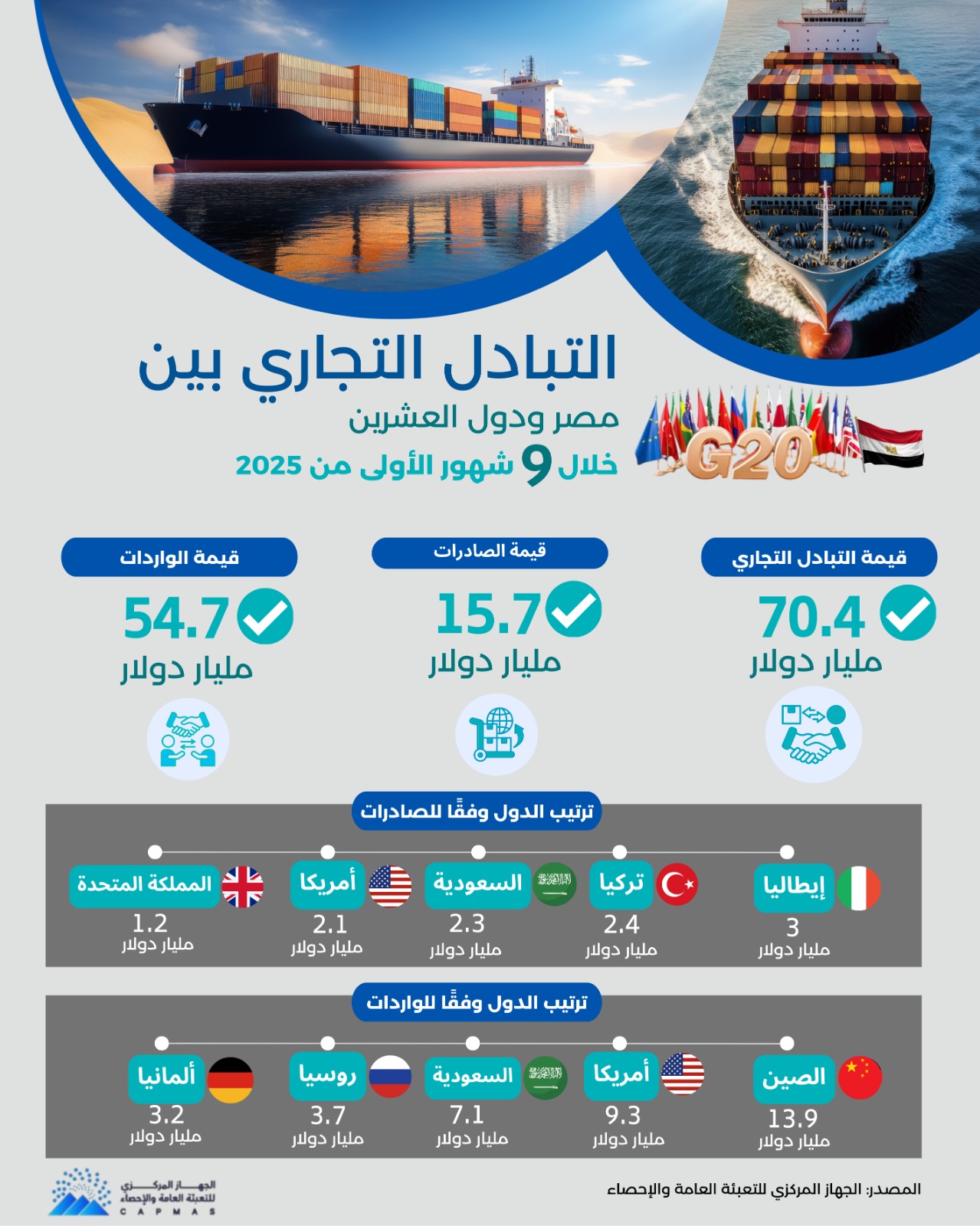 وقد كشفت بيانات الجهاز عن ارتفاع حجم التبادل التجاري بين مصر ومجموعة دول العشرين ليصل إلى 70.4 مليار دولار خلال الفترة من يناير حتى سبتمبر 2025 مقابل 61.7 مليار دولار خلال نفس الفترة من عام 2024 بنسبة ارتفاع قدرها 14.1 % .