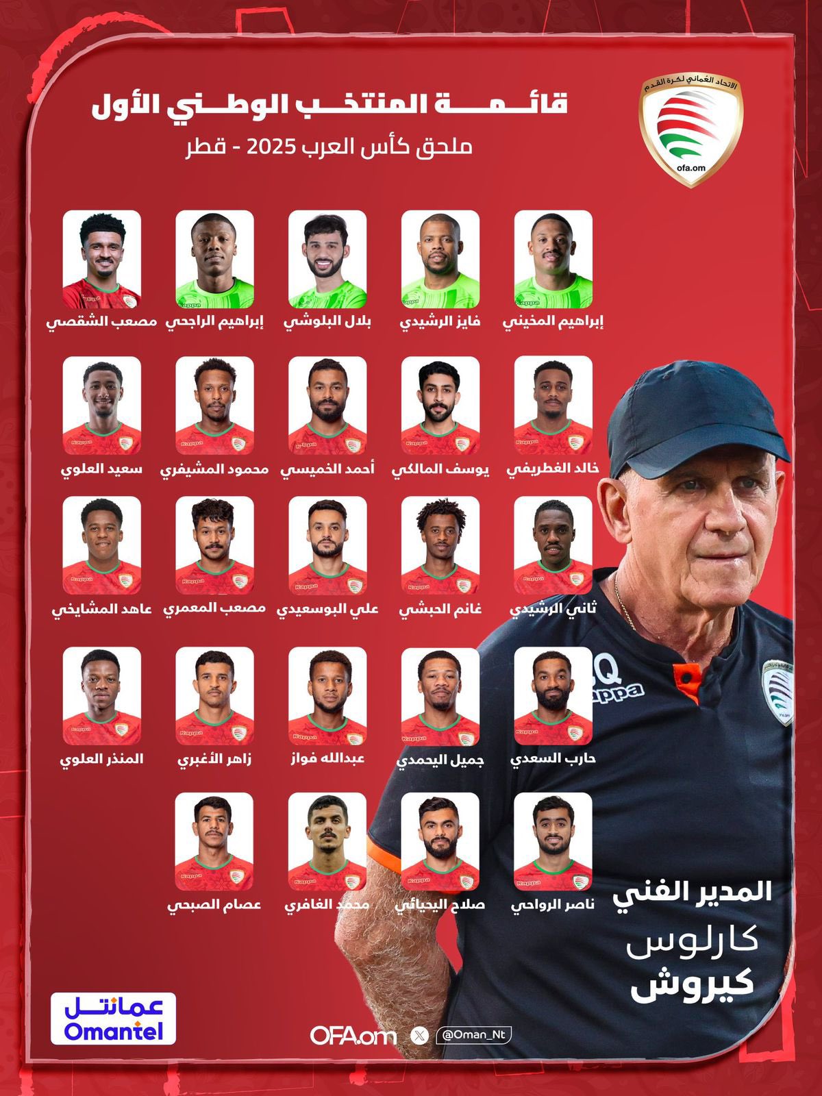 أعلن البرتغالي كارلوس كيروش، المدير الفني للمنتخب العُماني الأول، القائمة الرسمية المشاركة في بطولة كأس العرب 2025 المقررة في قطر خلال الفترة من 1 إلى 18 ديسمبر، وذلك بعد فترة طويلة من المتابعة الفنية والتقييمات الفردية للاعبين.