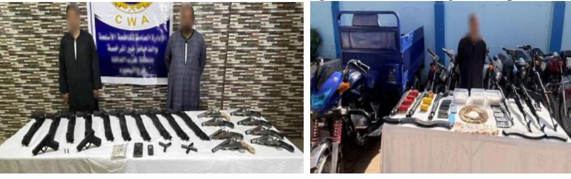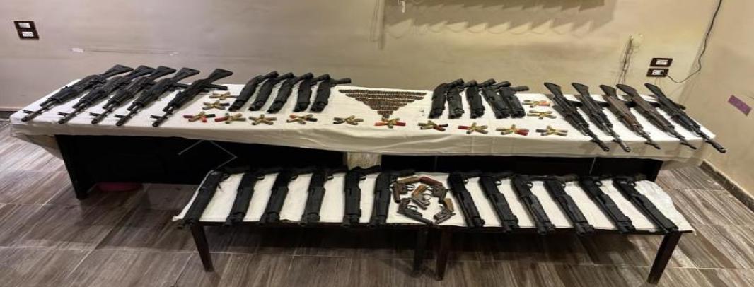 • 98 قطعة سلاح ناري شملت: 22 بندقية آلية، 43 بندقية خرطوش، 29 فرد خرطوش، 3 طبنجات، رشاش.