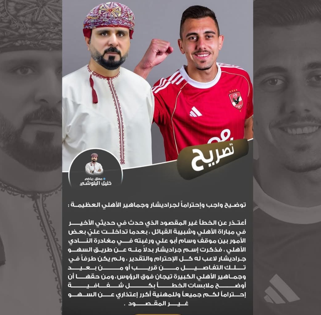 أصدر للمعلق الرياضي المتميز خليل البلوشي اعتذار رسمي لمهاجم النادي الأهلي الدولي جراديشار بعد مباراة شبيبة القبائل مساء أمس والتي حسمها الأحمر برباعية لصالحه.