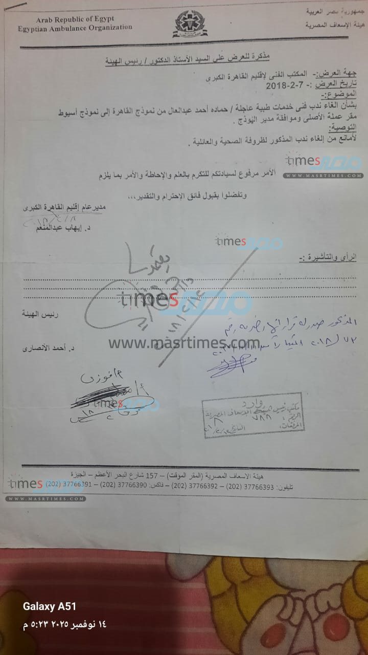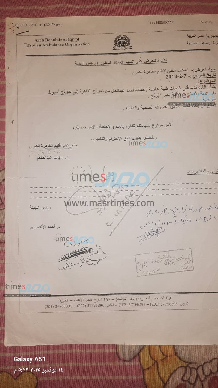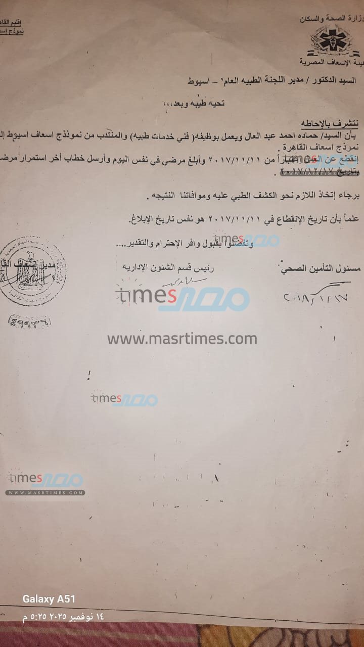 وحصل موقع «مصر تايمز» على نسخ من الأوراق الرسمية التي تثبت موقف المسعف في كل من فصله الأول والثاني، والتي تؤكد تقديمه للإجازة المرضية الرسمية وموافقة الإدارة عليها، بالإضافة إلى تقارير تثبت خبرته الطويلة ومدة خدمته.