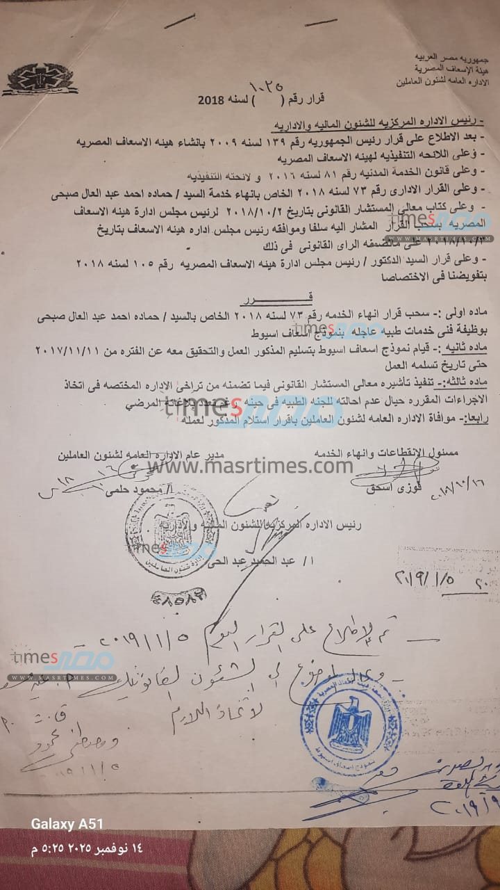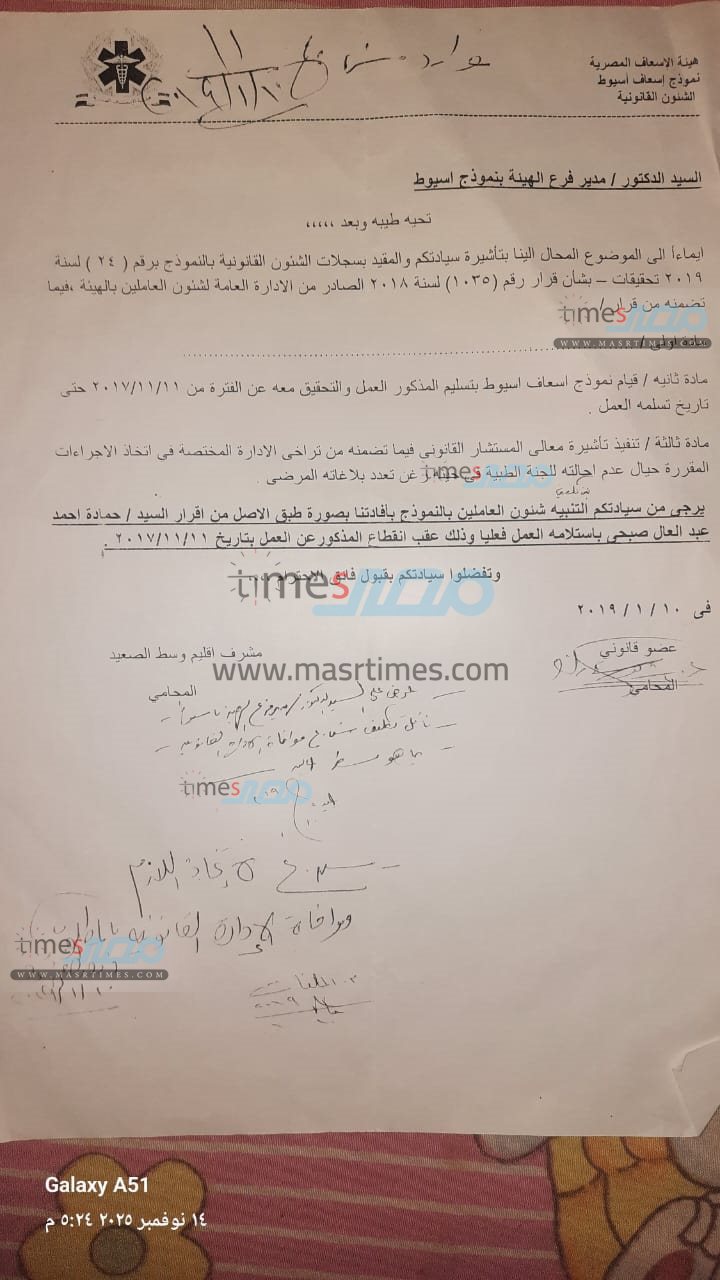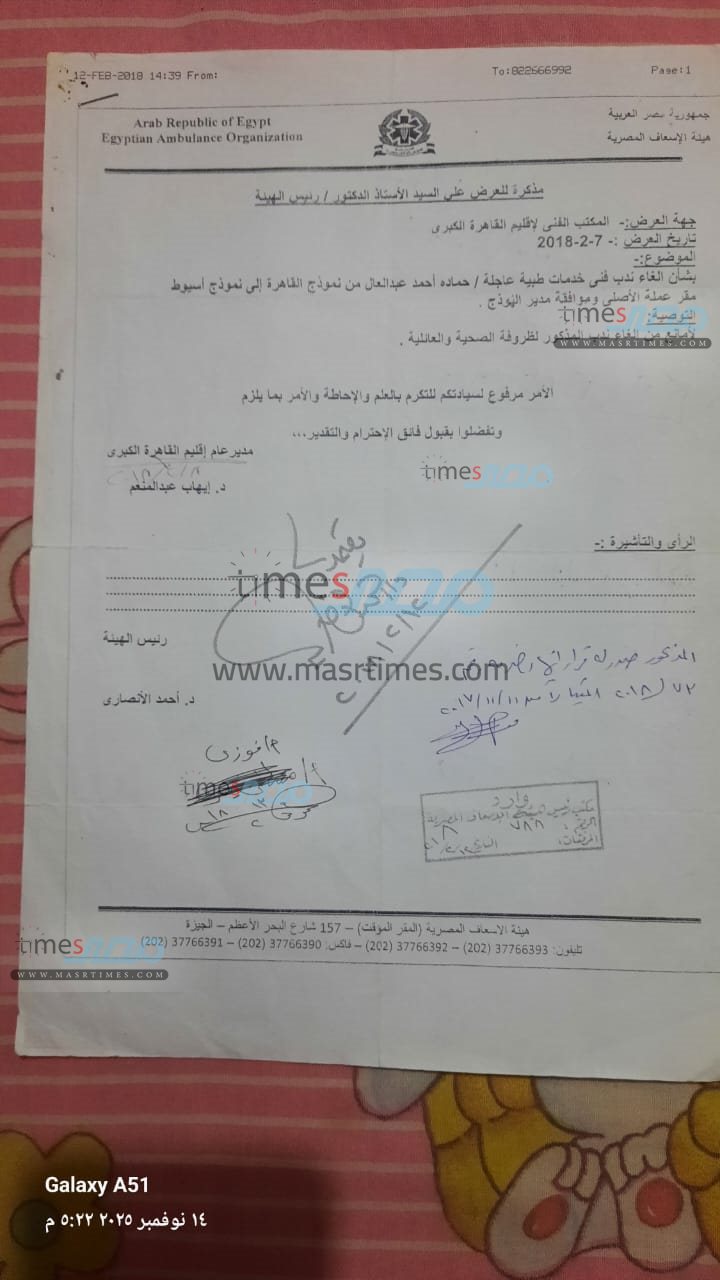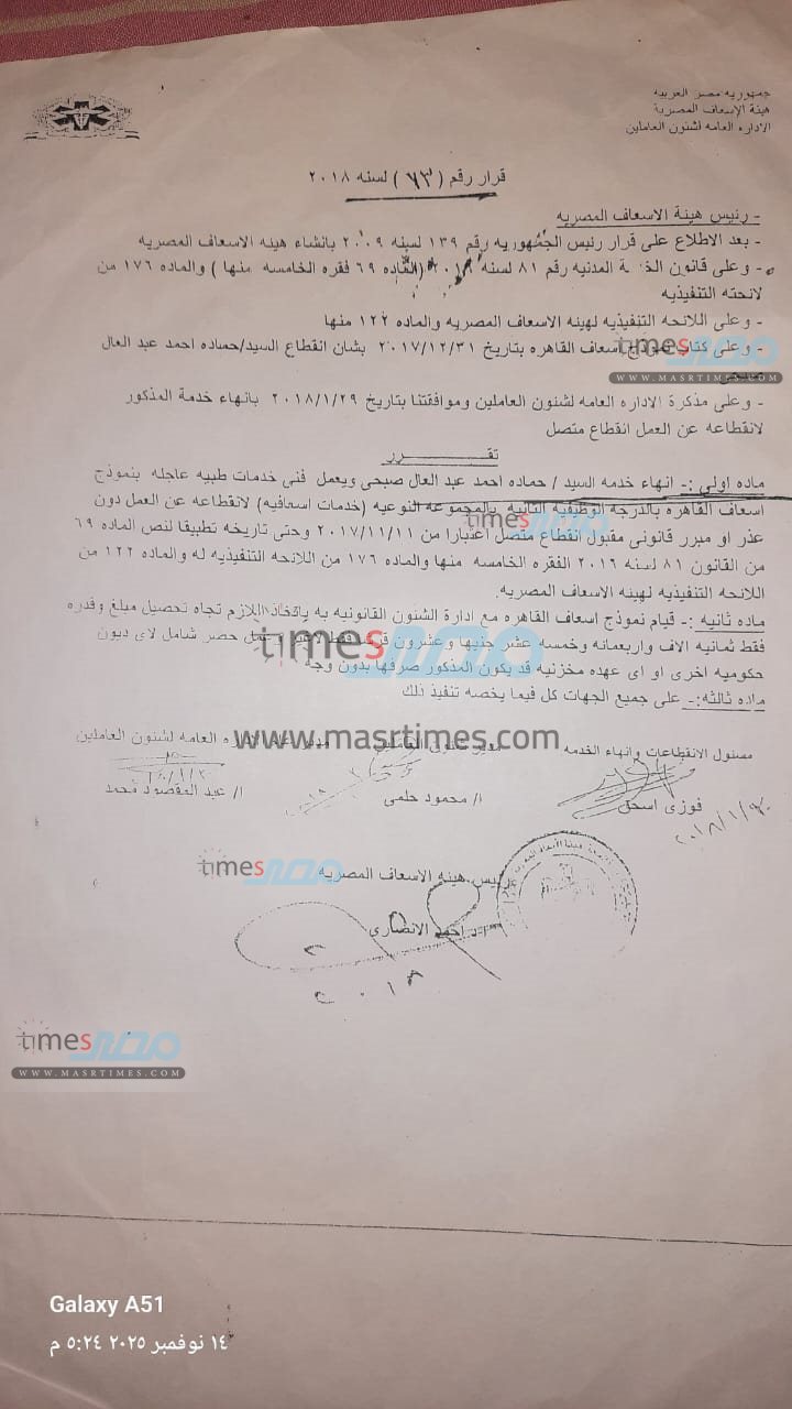 وحصل موقع «مصر تايمز» على نسخ من الأوراق الرسمية التي تثبت موقف المسعف في كل من فصله الأول والثاني، والتي تؤكد تقديمه للإجازة المرضية الرسمية وموافقة الإدارة عليها، بالإضافة إلى تقارير تثبت خبرته الطويلة ومدة خدمته.
