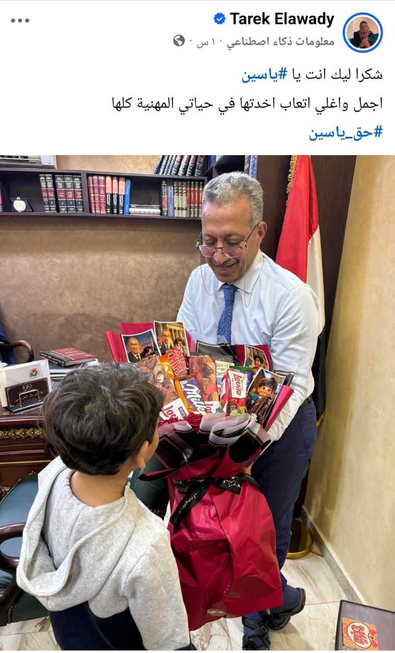 نشر طارق العوضي رئيس هيئة الدفاع عن الطفل ياسين "صغير لام شمسية" بمحافظة البحيرة، صورة تجمعه مع الطفل ياسين معلقا عليها "شكرا ليك انت يا ياسين .. أجمل وأغلي أتعاب أخدتها في حياتي المهنية كلها".