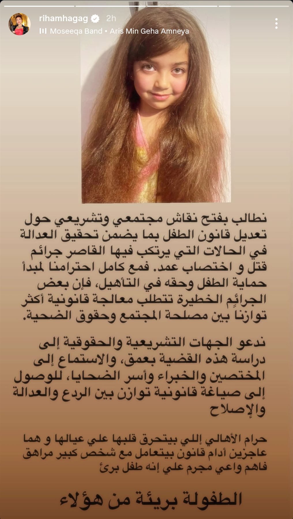 وأكدت ريهام حجاج من خلال ستوري لها عبر حسابها الرسمي على موقع تبادل الصور والفيديوهات القصيرة إنستجرام، أن احترام حقوق الطفل لا يجب أن يتعارض مع حماية المجتمع وحقوق الضحايا، موضحة أن بعض الجرائم تُعد بالغة الخطورة وتتطلب معالجة قانونية أكثر توازنًا بين الردع والإصلاح.