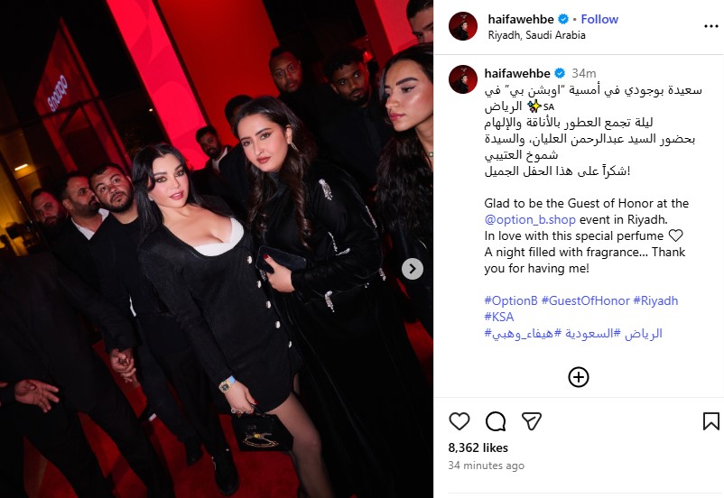 ونشرت هيفاء وهبي ألبوم صور من الإحتفالية، وذلك من خلال حسابها الرسمي عبر موقع تبادل الصور والفيديوهات القصيرة إنستجرام، وكتبت: سعيدة بوجودي في أمسية اوبشن بي في الرياض.. ليلة تجمع العطور بالأناقة والإلهام.