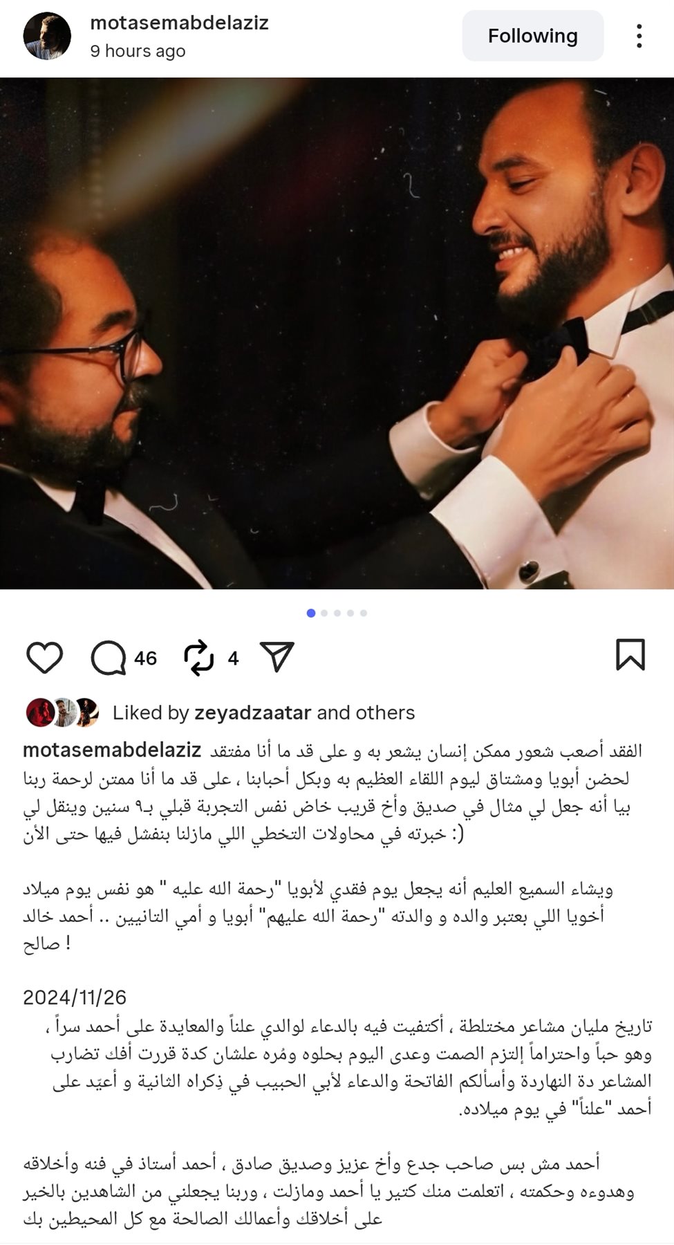 أضاف: ويشاء السميع العليم أنه يجعل يوم فقدي لأبويا "رحمة الله عليه " هو نفس يوم ميلاد أخويا اللي بعتبر والده ووالدته "رحمة الله عليهم" أبويا و أمي التانيين .. أحمد خالد صالح.