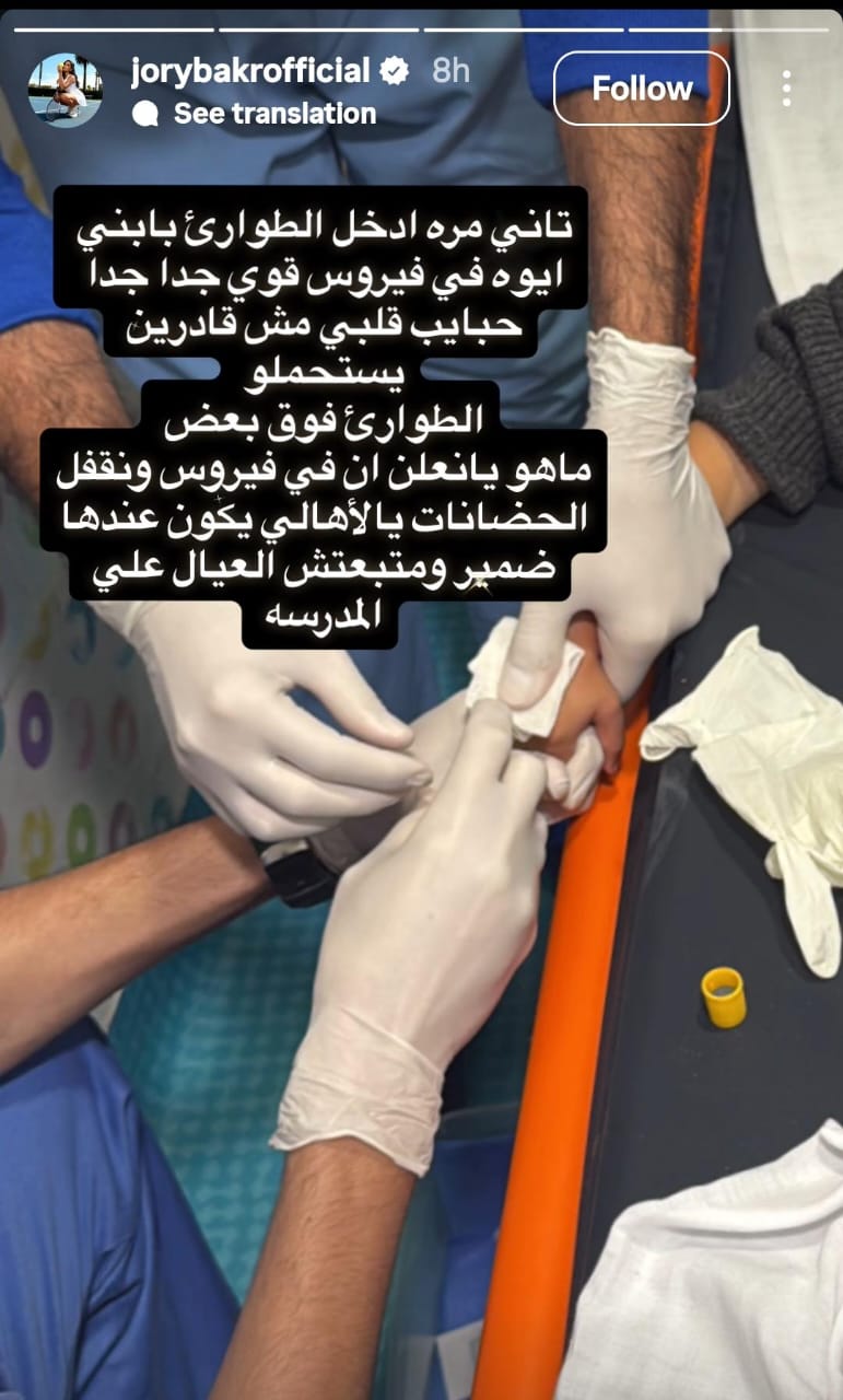 كشفت الفنانة جوري بكر، عن تعرض ابنها لأزمة صحية، ودخل على إثرها الطوارئ لثاني مرة، حيث نشرت جوري عبر خاصية ستوري علي حسابها الرسمي بموقع “إنستجرام”، صورة من تلقي ابنها للعلاج داخل إحدى المستشفيات.