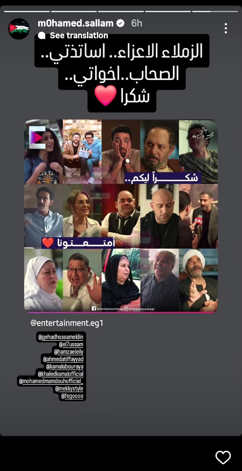 و وجه بطل العمل الفنان محمد سلام، رسالة شكر لكل من شارك في مسلسل "كارثة طبيعية"، حيث نشر عبر خاصية ستوري علي حسابه الرسمي بموقع "انستجرام"، قائلا: "الزملاء الأعزاء اساتذتي الصحاب اخواتي شكرا ليكم".