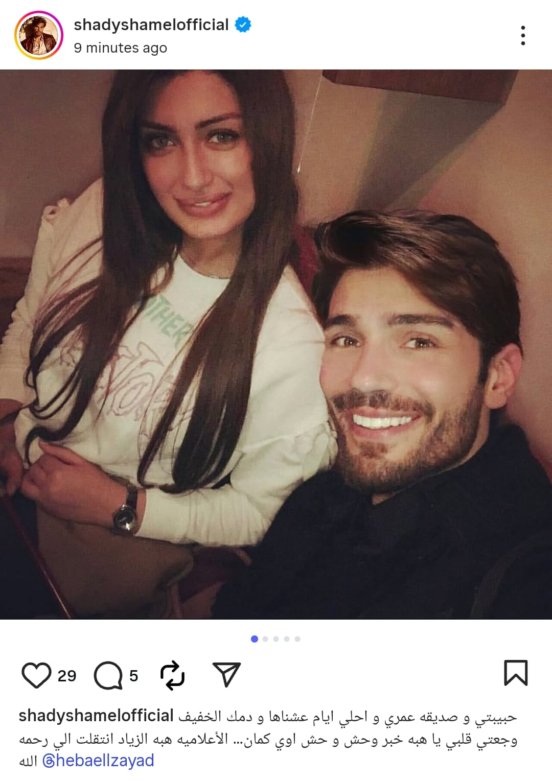 ونشر شادي شامل صورا تجمعهما من خلال حسابه الرسمي عبر موقع تبادل الصور والفيديوهات القصيرة إنستجرام، وكتب: حبيبتي وصديقة عمري واحلى أيام عشناها ودمك خفيف وجعتي قلبي يا هبة خبر وحش وحش اوي كمان.. الإعلامية هبة الزياد انتقلت إلى رحمة الله.