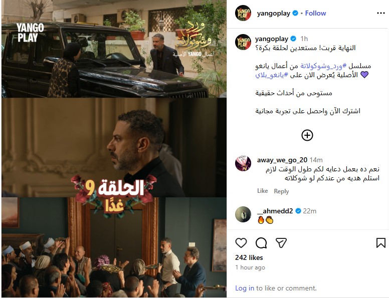 وكتبت يانجو بلاي من خلال حسابها الرسمي عبر موقع تبادل الصور والفيديوهات القصيرة إنستجرام: النهاية قربت! مستعدين لحلقة بكرة؟.. مسلسل ورد وشوكولاتة من أعمال يانغو الأصلية يُعرض الان على يانغو بلاي.. مستوحى من أحداث حقيقية.