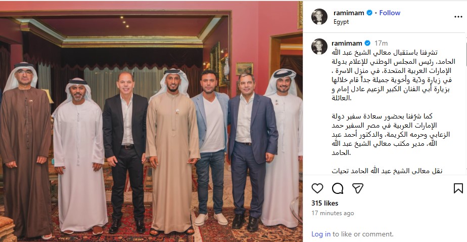 ونشر رامي إمام صورة تجمعه بهذا الوفد، وذلك من خلال حسابه الرسمي عبر موقع تبادل الصور والفيديوهات القصيرة إنستجرام، وكتب: تشرفنا باستقبال معالي الشيخ عبد الله الحامد، رئيس المجلس الوطني للإعلام بدولة الإمارات العربية المتحدة، في منزل الاسرة ، في زيارة ودّية وأخوية جميلة جداً قام خلالها بزيارة أبي الفنان الكبير الزعيم عادل إمام و العائلة.