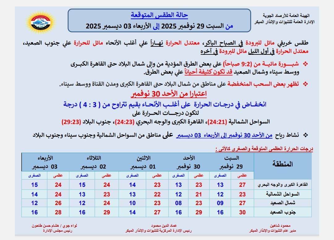 كشفت الهيئة العامة للأرصاد الجوية عن تفاصيل حالة الطقس المتوقعة على مستوى الجمهورية خلال الفترة من يوم السبت الموافق 29 نوفمبر، وحتى يوم الأربعاء الموافق 3 ديسمبر 2025. وتتسم التوقعات باستمرار الأجواء الخريفية المعتدلة نهارًا، مع تحذيرات مشددة للسائقين من ظاهرة جوية مؤثرة.
