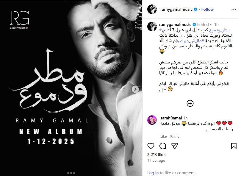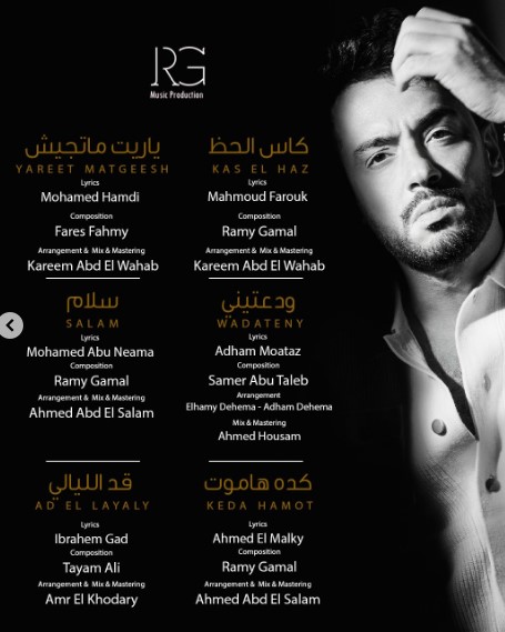 الجدير بالذكر طرح رامي جمال مؤخرا أحدث ألبوماته الغنائية بعنوان "محسبتهاش"، والذي حقق تفاعلا كبيرا بين الجمهور، وحقق أعلى نسب استماع مرتفعة على مختلف المنصات الرقمية.