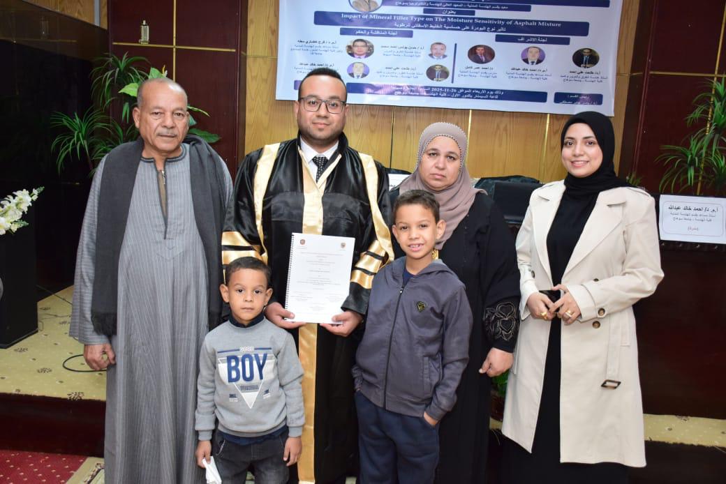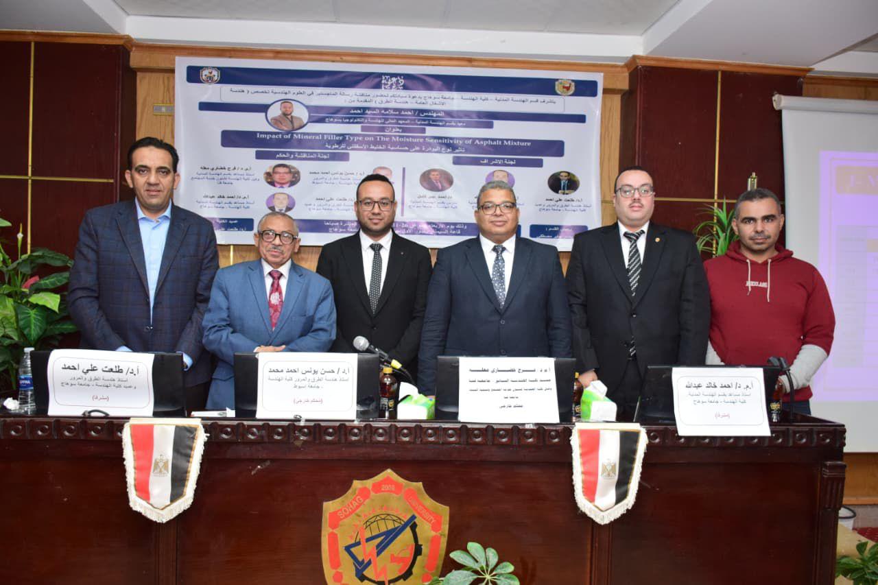 جدير بالذكر أن لجنة الإشراف كانت مكونة من ا.د/ طلعت علي احمد أستاذ هندسة الطرق والمرور ، أ.م. د/احمد خالد عبد الله أستاذ مساعد بقسم الهندسة المدنية ، د أحمد عمر كامل المدرس بقسم الهندسة المدنية ولجنة التحكيم على الرسالة كانت مكونه من أ.د/حسن يونس احمد محمد أستاذ هندسة الطرق والمرور – كلية الهندسة – جامعة أسيوط، ا.د/ فرج خضاري معله وكيل كلية الهندسة لشئون خدمة المجتمع وتنمية البيئة – جامعة قنا، ا.د/ طلعت علي احمد أستاذ هندسة الطرق والمرور – كلية الهندسة – جامعة سوهاج، أ.م. د/احمد خالد عبد الله أستاذ مساعد بقسم الهندسة المدنية -كلية الهندسة – جامعة سوهاج