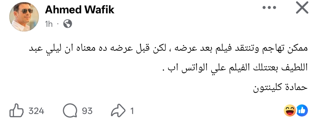 وكتب أحمد وفيق من خلال حسابه الرسمي عبر موقع التواصل الاجتماعي فيسبوك، قال: ممكن تهاجم وتنتقد فيلم بعد عرضه، لكن قبل عرضه ده معناه ان ليلى عبد اللطيف بعتتلك الفيلم على الواتس اب.. حمادة كلينتون.