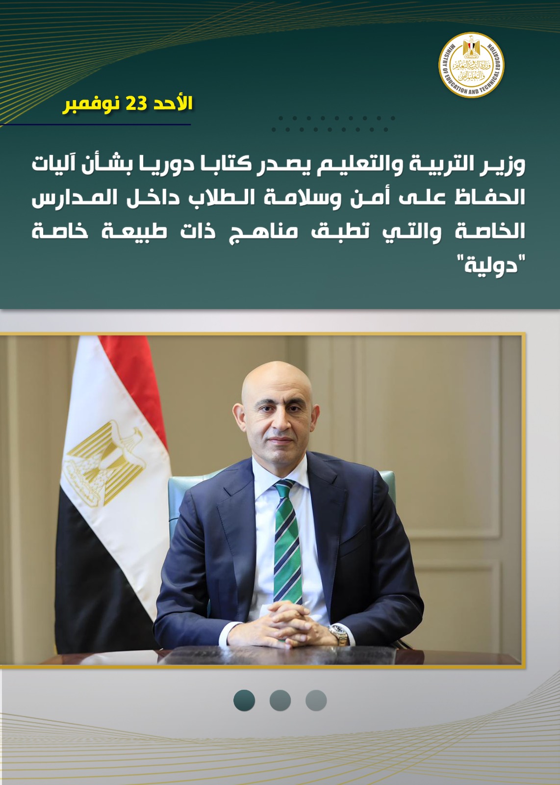 تُصدر وزارة التربية والتعليم والتعليم الفني الكتاب الدوري رقم (19) بتوجيهات صارمة لحماية أمن وسلامة الطلاب داخل المدارس الخاصة والدولية، حيث تُلزم المدارس بتحديث أنظمة المراقبة وتغطية كل المساحات داخل الفصول والساحات، مع تكليف موظفين بمتابعة الكاميرات طوال اليوم الدراسي والإبلاغ الفوري عن أي مخالفات.
