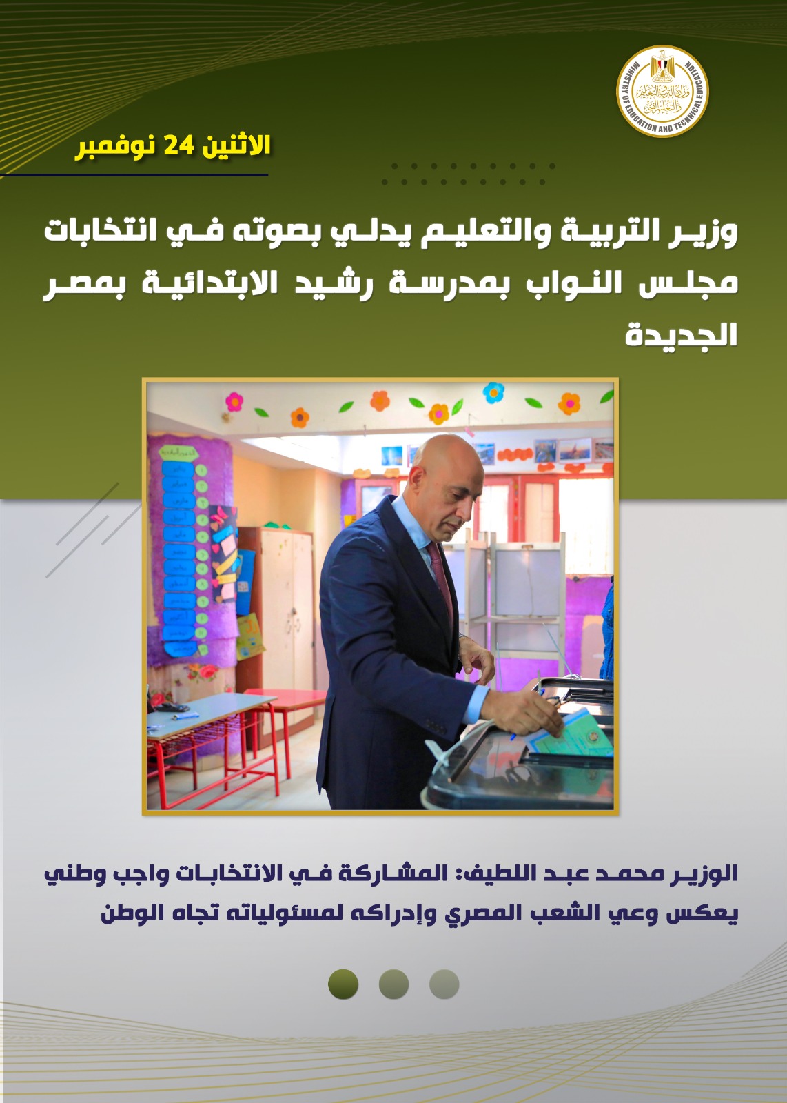 يدلي الدكتور محمد عبد اللطيف وزير التربية والتعليم بصوته في انتخابات مجلس النواب بمدرسة رشيد الابتدائية، حيث يؤكد أهمية المشاركة الوطنية ودورها في ترسيخ الوعي الشعبي، مشددًا على جاهزية المدارس لضمان سير العملية الانتخابية وعودة الطلاب فور انتهائها.