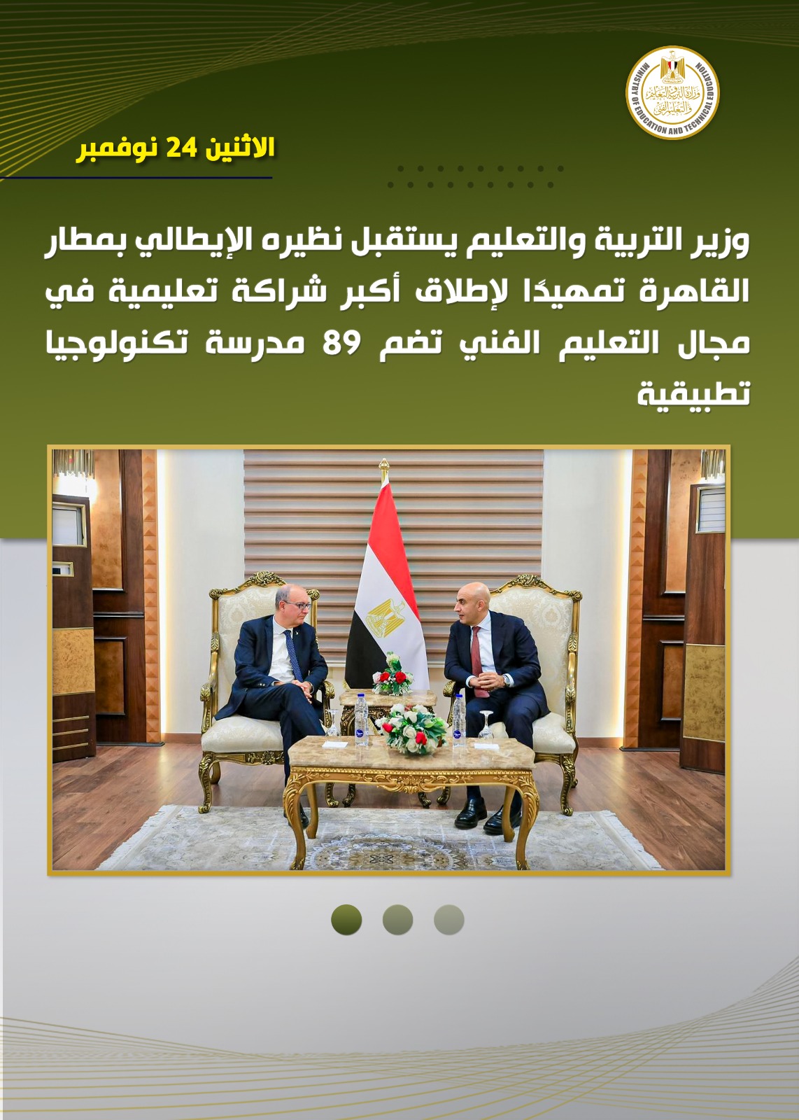 وخلال اللقاء يُشيد الوزير بالعلاقات المصرية الإيطالية وبدورها في تطوير التعليم الفني، مؤكدًا أن مصر تضع هذا القطاع على قمة أولوياتها لتأهيل كوادر قادرة على المنافسة.
