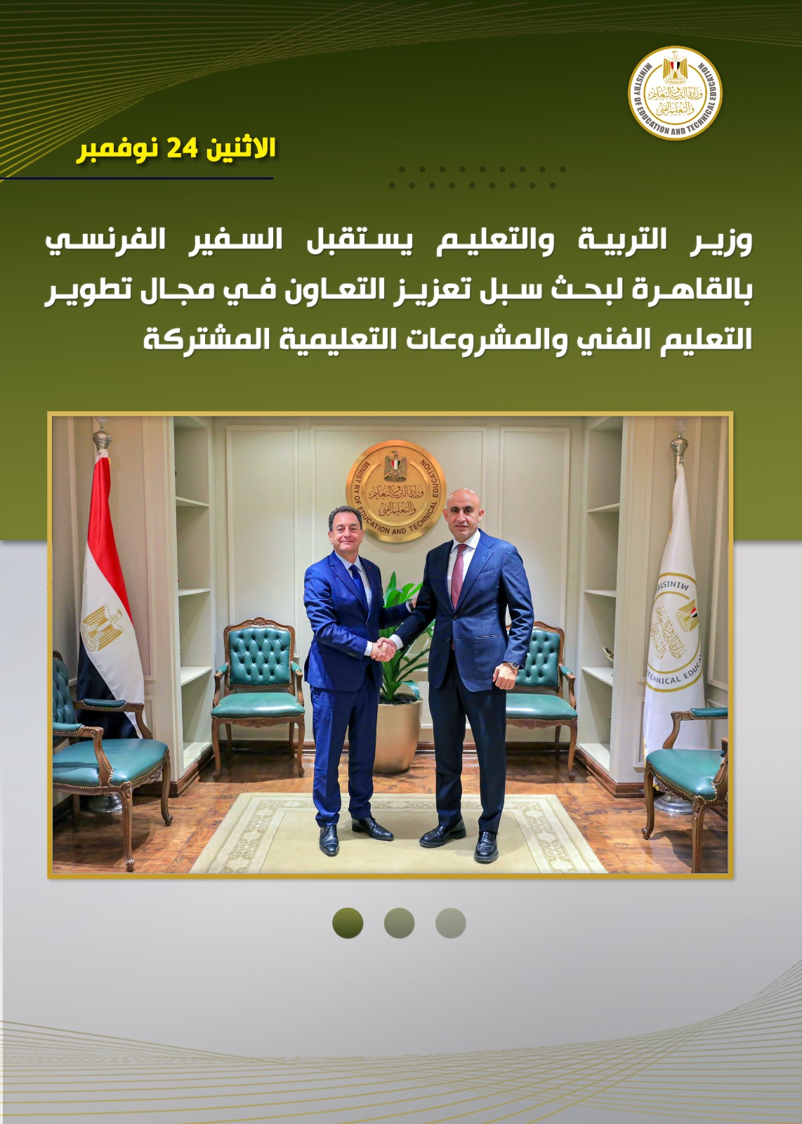 يستقبل الوزير السفير الفرنسي إريك شوفالييه لبحث تطوير التعليم الفني.