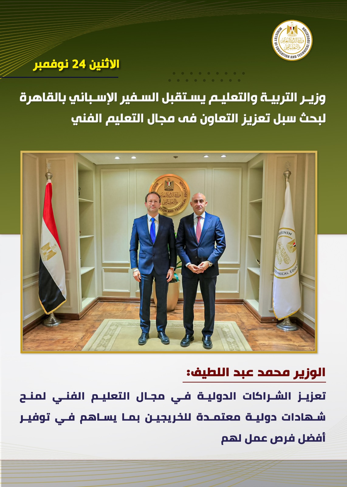 وخلال اللقاء يُبرز الوزير أهمية تبادل الخبرات مع المؤسسات الإسبانية، مشيرًا إلى بروتوكولات التعاون القائمة مع إيطاليا وإطلاق 89 مدرسة جديدة.