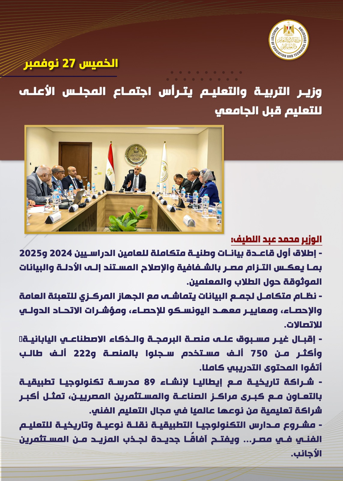 الخميس ٢٧ نوفمبر ٢٠٢٥ — اجتماع المجلس الأعلى للتعليم قبل الجامعي