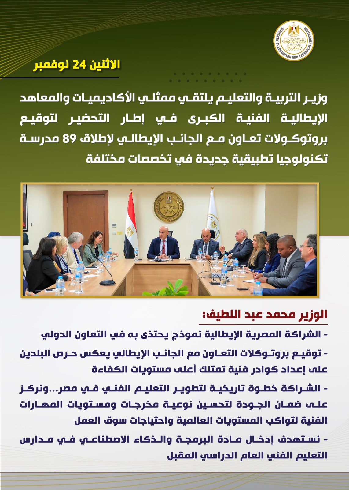 يلتقي وزير التعليم بعدد من ممثلي الأكاديميات والمعاهد الإيطالية، في إطار التحضيرات لتوقيع بروتوكولات تعاون لإطلاق 89 مدرسة تكنولوجيا تطبيقية جديدة.