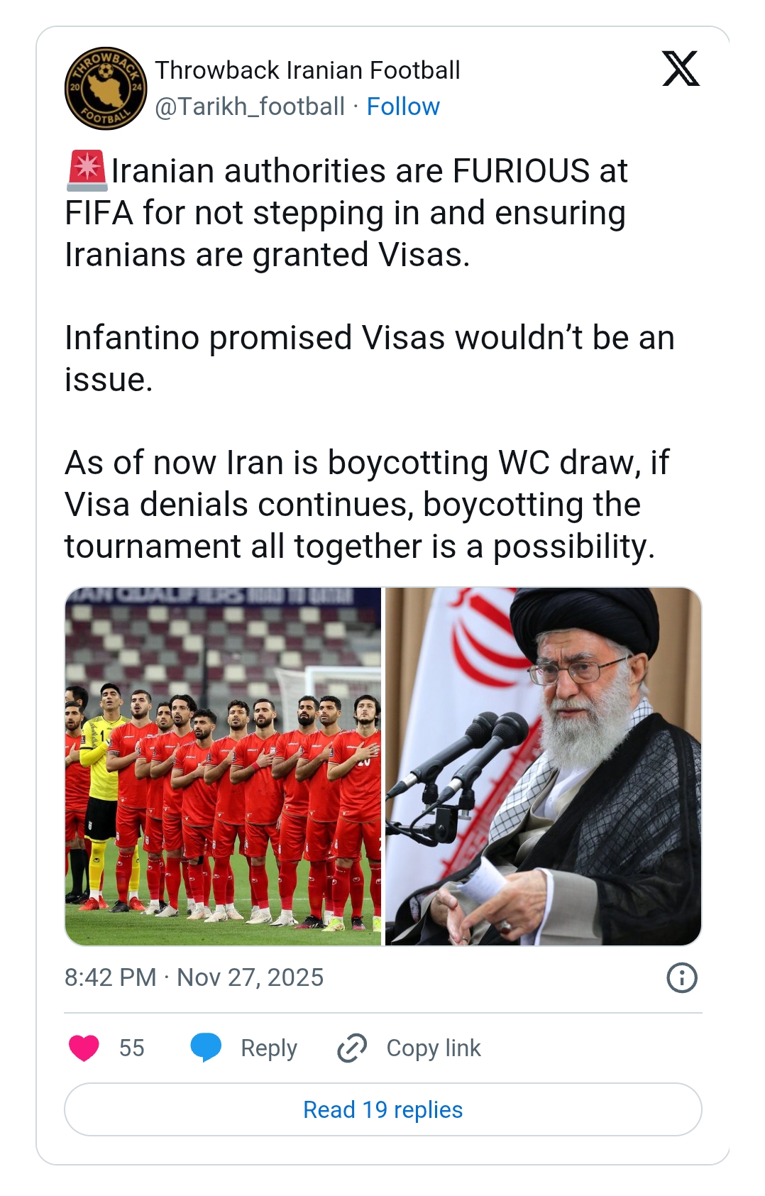 قبل أسبوع واحد من مراسم قرعة كأس العالم 2026 المقررة في الخامس من ديسمبر بواشنطن العاصمة، أعلن الاتحاد الإيراني لكرة القدم أن وفده لن يشارك في الحدث بعد رفض السلطات الأمريكية منح تأشيرات لعدد من أعضائه.
