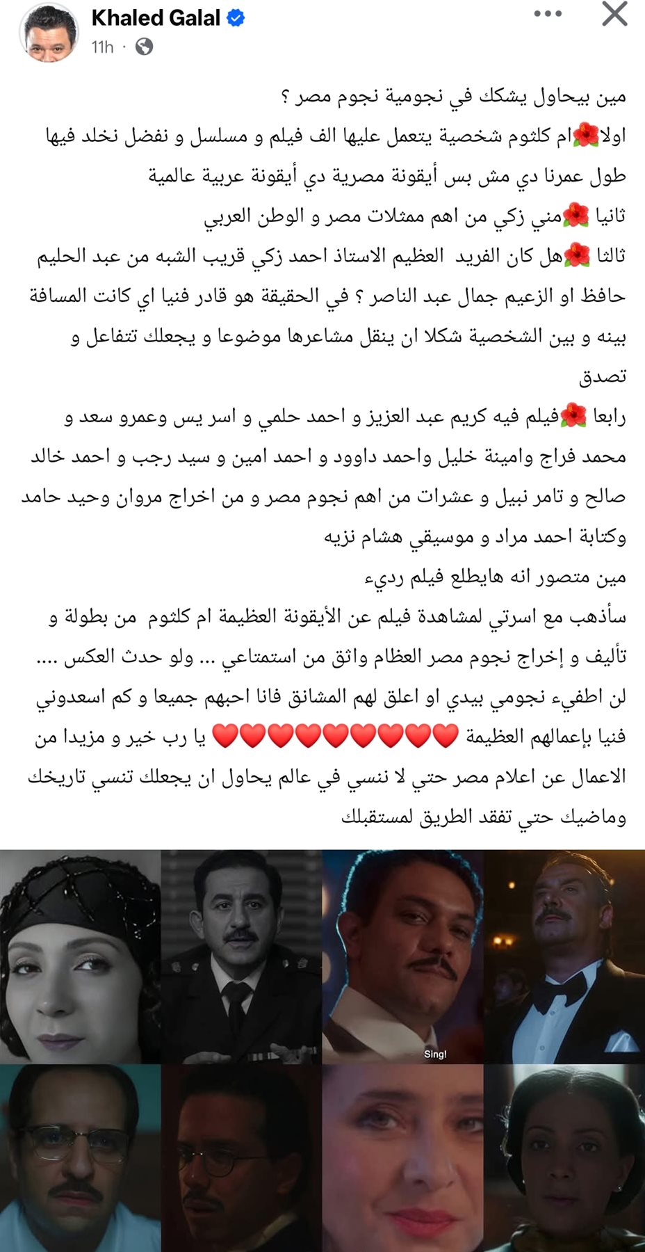 وكتب خالد جلال من خلال حسابها الرسمي عبر موقع التواصل الاجتماعي فيسبوك، قال: مين بيحاول يشكك في نجومية نجوم مصر؟.. اولا: ام كلثوم شخصية يتعمل عليها الف فيلم و مسلسل و نفضل نخلد فيها طول عمرنا دي مش بس أيقونة مصرية دي أيقونة عربية عالمية.