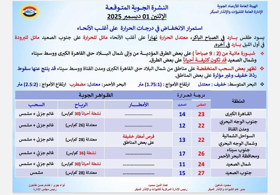 درجات الحرارة المتوقعة اليوم الإثنين 1 ديسمبر 2025