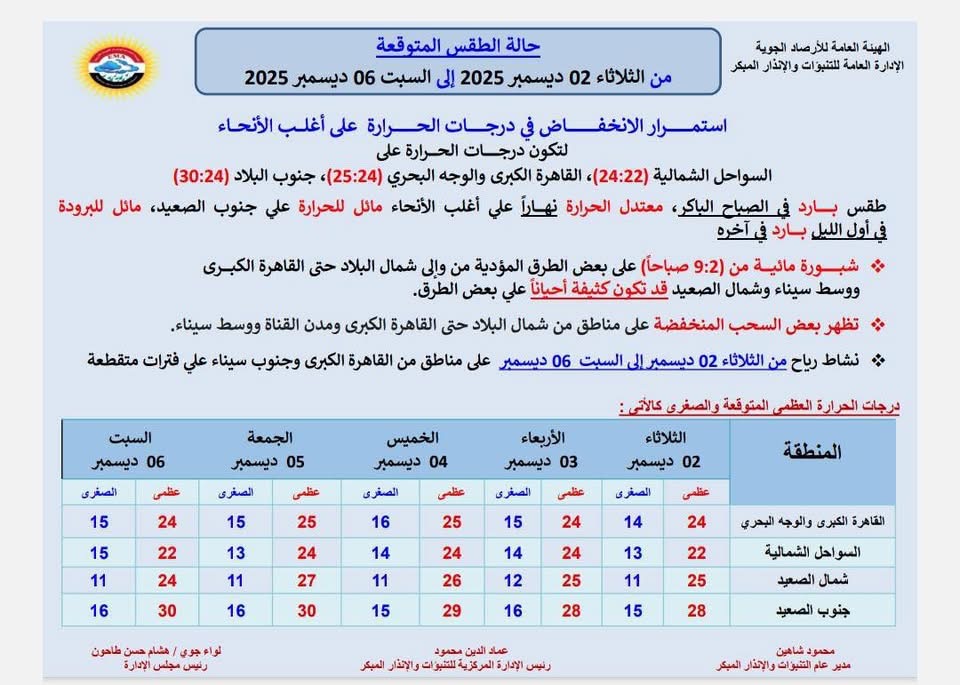 ويتوقع ظهور بعض السحب المنخفضة على مناطق من شمال البلاد حتى القاهرة الكبرى ومدن القناة ووسط سيناء قد ينتج عنها سقوط رذاذ خفيف وغير مؤثر على بعض المناطق.