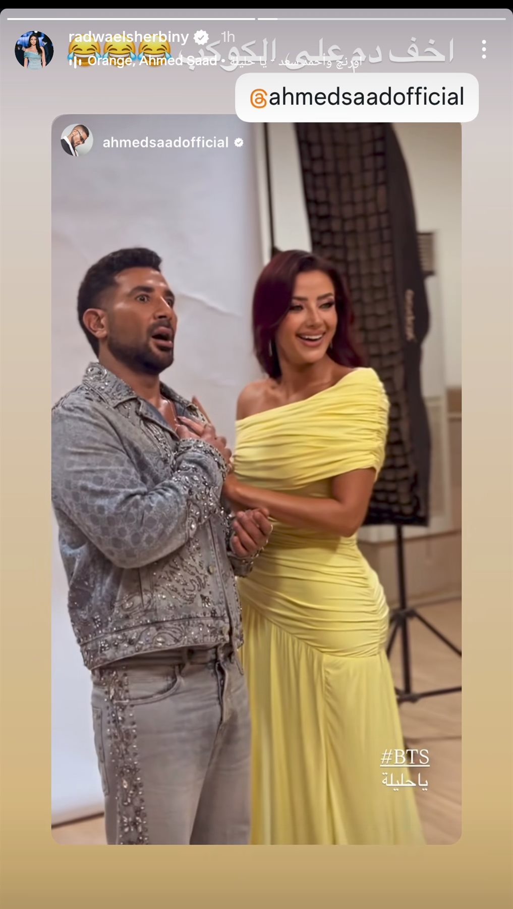 وشاركت رضوى الشربيني جمهورها مقطع فيديو طريف جمعهما، من خلال حسابها الرسمي عبر موقع تبادل الصور والفيديوهات القصيرة إنستجرام، عبر خاصية ستوري، وكتبت: أخف دم على الكوكب.