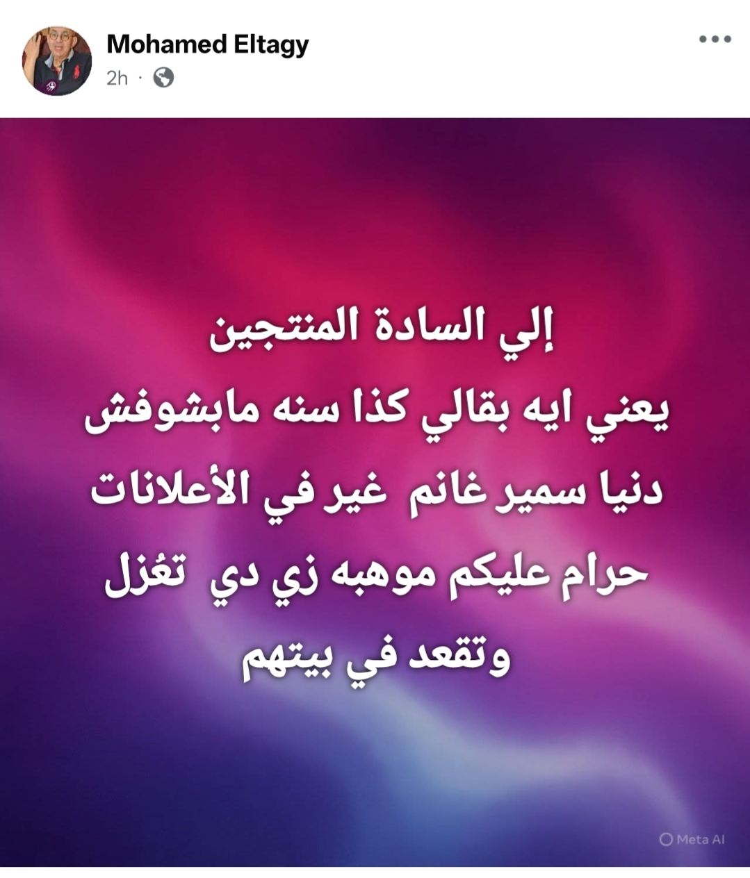 وكتب محمد التاجي من خلال حسابه الرسمي عبر موقع التواصل الاجتماعي فيسبوك، قال: إلى السادة المنتجين يعني إيه بقالي كذا سنة مابشوفش دنيا سمير غانم غير في الإعلانات حرام عليكم موهبة زي دي تُعزل وتقعد في بيتهم.