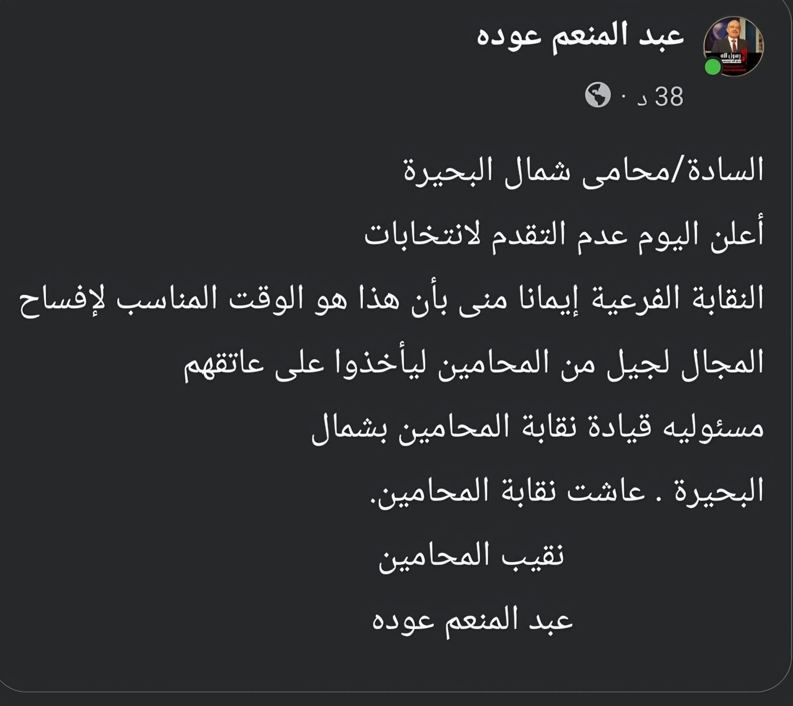 وقال “عوده” في بيان له موجّه إلى محامي شمال البحيرة، إنه يرى أن الوقت الحالي هو الأنسب لتمكين شباب المحامين ومنحهم الفرصة لاستكمال مسيرة العمل النقابي، مؤكدًا ثقته في قدرتهم على تطوير النقابة والدفاع عن حقوق أعضائها.