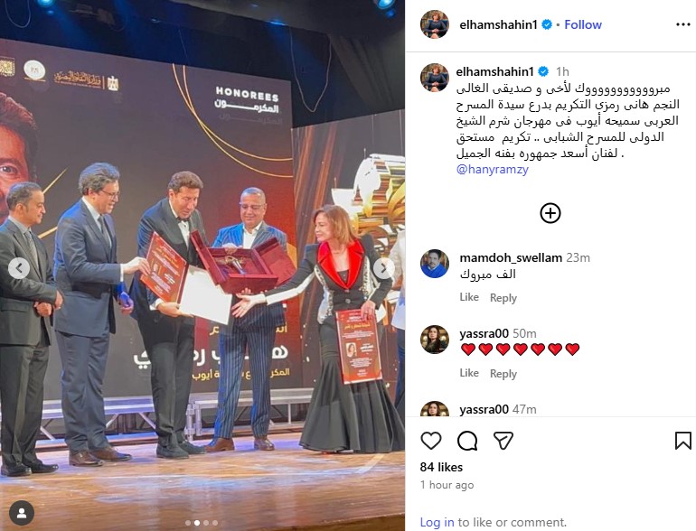 حرصت الفنانة إلهام شاهين على تهنئة الفنان هاني رمزي، وذلك بعد تكريمه في مهرجان شرم الشيخ الدولي للمسرح الشبابي، ومنحه درع سيدة المسرح العربي سميحة أيوب.