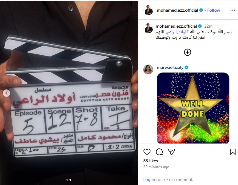 وشارك محمد عز جمهوره صور من أول يوم تصوير حاملًا الكلاكيت الخاص بالعمل، وذلك من خلال حسابه الرسمي عبر موقع تبادل الصور والفيديوهات القصيرة إنستجرام، وعلق: بسم الله توكلت علي الله اولاد الراعي اللهم افتح لنا كرمك يا رب وتوفيقك.