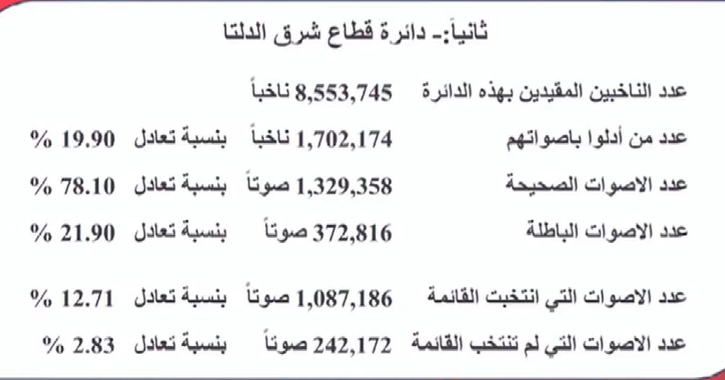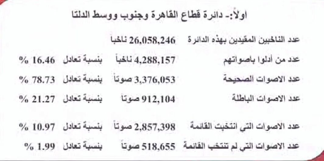 أعلنت الهيئة الوطنية للانتخابات، في بيانها الرسمي، النتائج الإحصائية للتصويت في نظام القوائم بقطاعي القاهرة وجنوب ووسط الدلتا و شرق الدلتا، والتي شهدت مشاركة تجاوزت ثلاثة ملايين صوت في الدائرتين مجتمعتين.