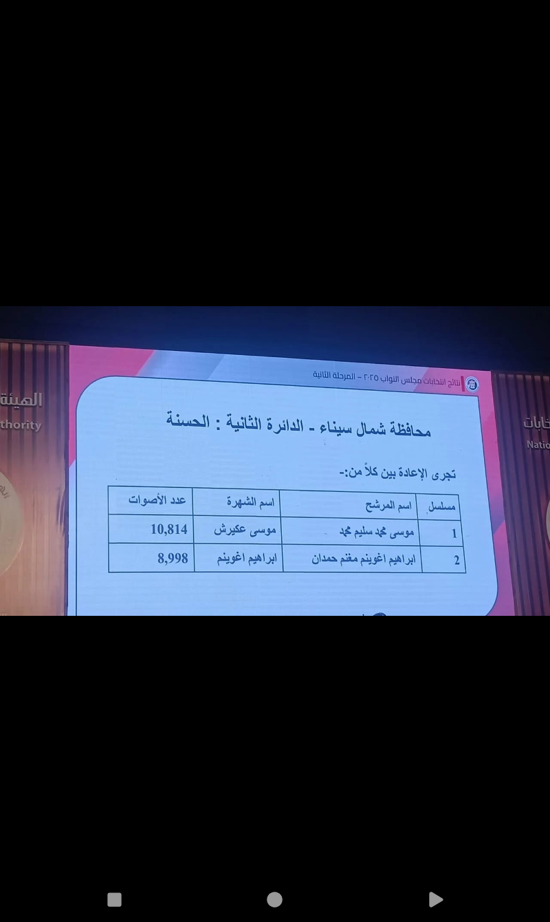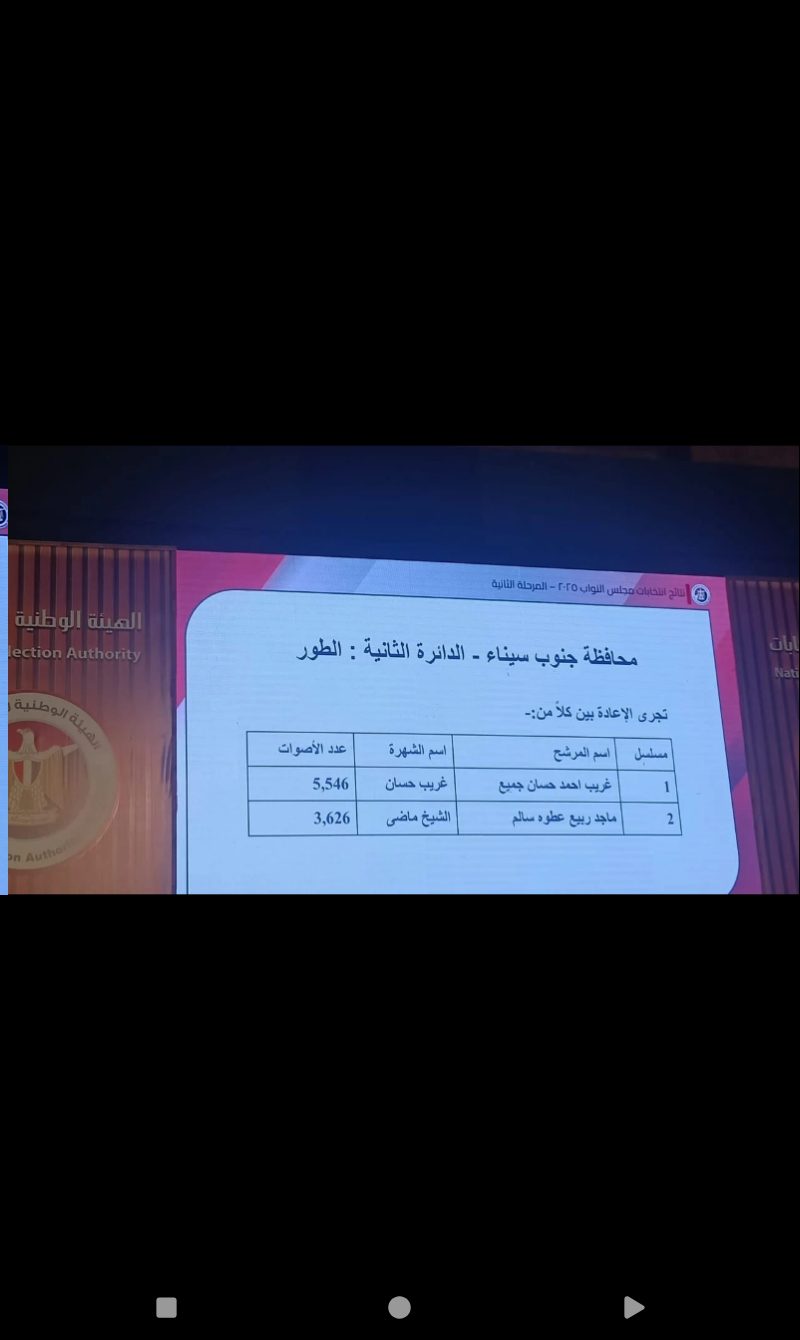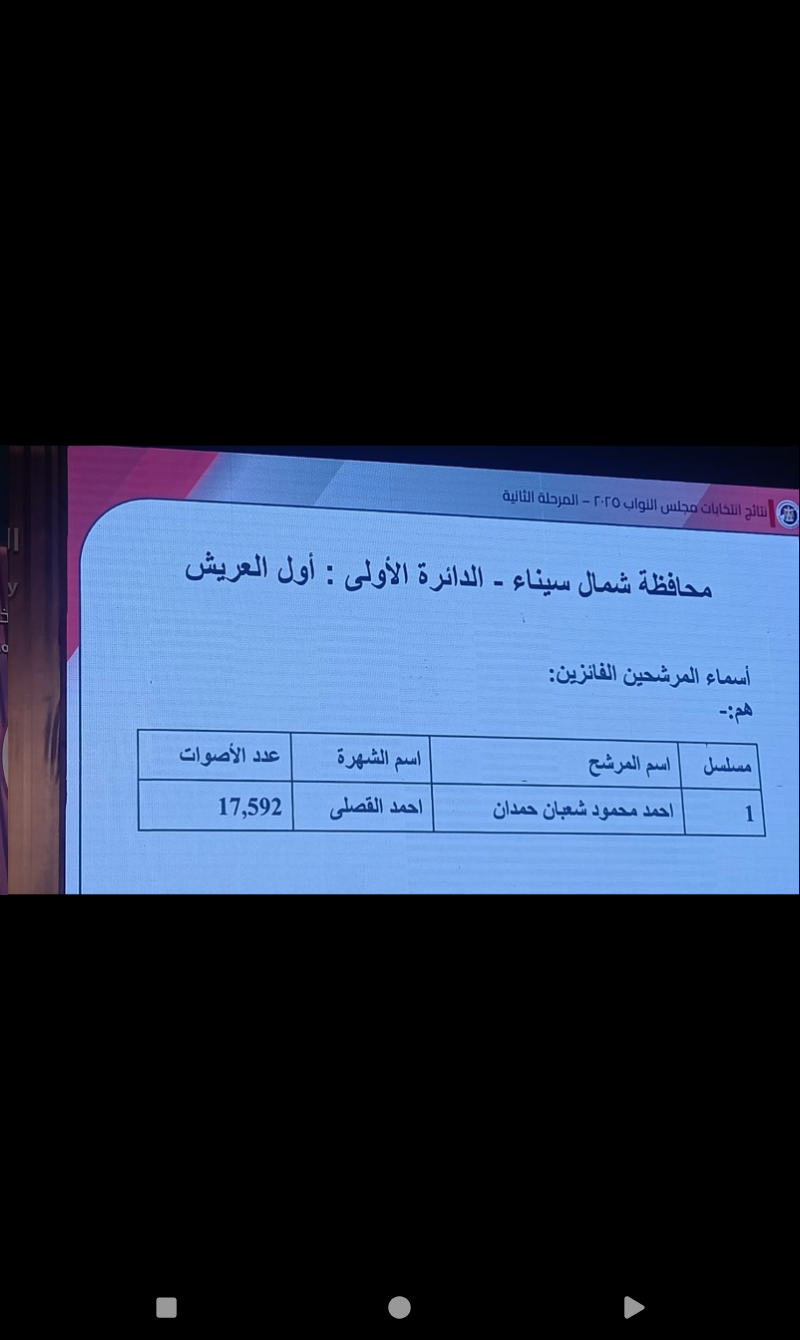 أعلنت الهيئة الوطنية للانتخابات النتائج الرسمية لانتخابات مجلس النواب في دوائر محافظتي شمال وجنوب سيناء، وذلك ضمن نتائج المرحلة الثانية التي تم الإعلان عنها اليوم الثلاثاء الموافق 2 ديسمبر 2025.