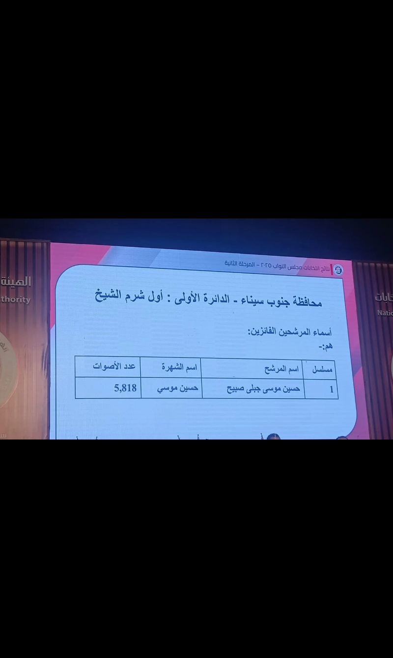 أعلنت اللجنة العامة بجنوب سيناء نتائج الحصر العددي لأصوات الناخبين، حيث بلغ إجمالي عدد الناخبين الذين أدلوا بأصواتهم 11332 ناخبًا من إجمالي 36079 مقيدًا في اللجنة العامة رقم 1. وتم الإعلان عن الفائزين في المؤتمر الصحفي للهيئة.
