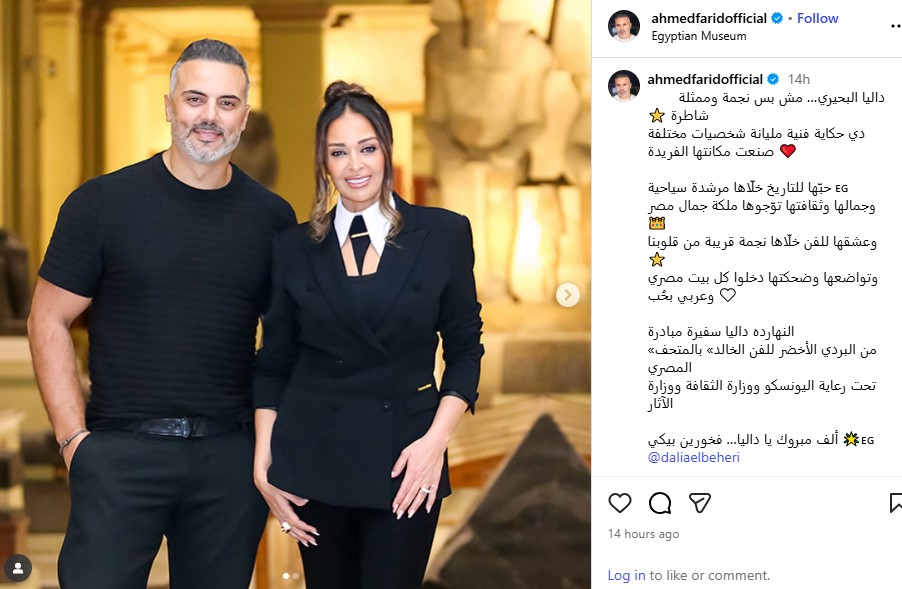 وجه الفنان أحمد فريد رسالة دعم لـ الفنانة داليا البحيري، وذلك بعد تعيينها سفيرة مبادرة من البردي الأخضر للفن الخالد، بالمتحف المصري.