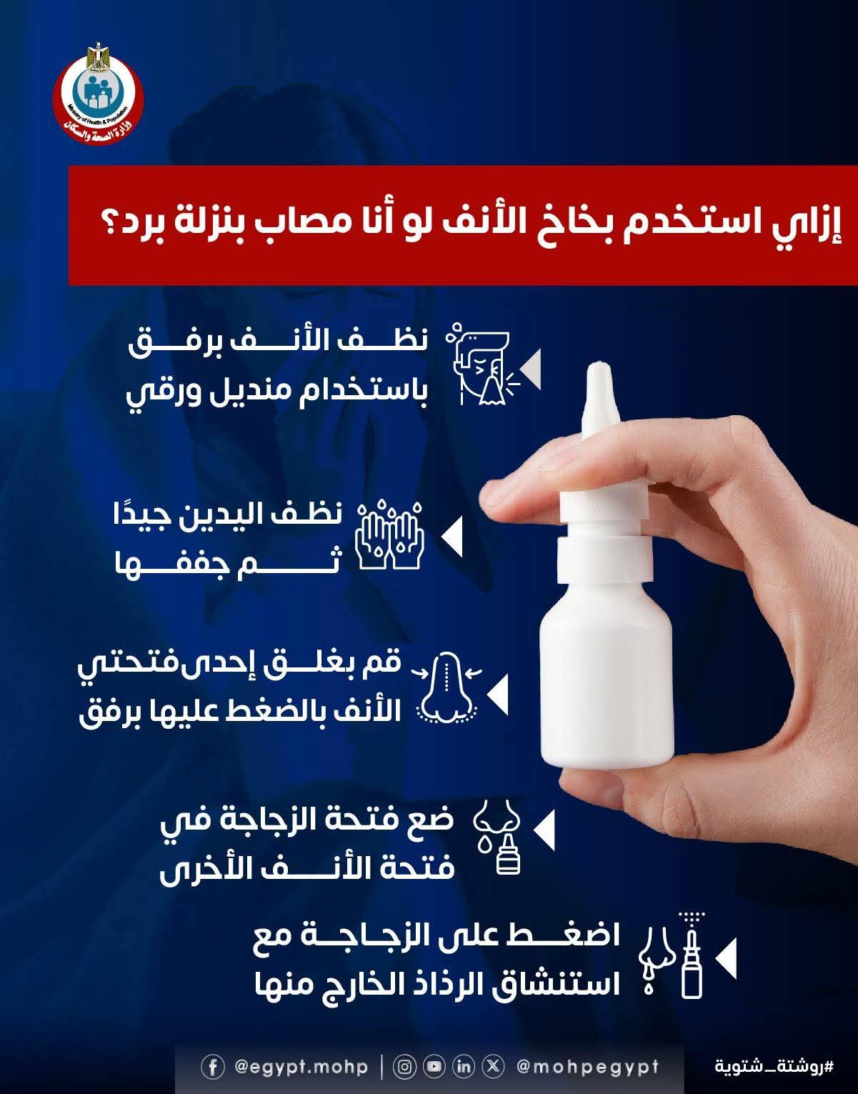 تُعد نزلات البرد من أكثر الأمراض الموسمية شيوعًا، وغالبًا ما يصاحبها انسداد الأنف وصعوبة التنفس، مما يدفع كثيرين لاستخدام بخّاخات الأنف للحصول على راحة سريعة. ومع ذلك، فإن الاستخدام الخاطئ للبخاخ قد يقلل من فعاليته أو يسبب آثارًا جانبية غير مرغوبة. وفي هذا السياق قدمت وزارة الصحة والسكان عن استخدام بخاخات الأنف حال الإصابة بنزلات البرد عبر صفحتها على موقع التواصل الاجتماعى فيسبوك حيث تضمنت :