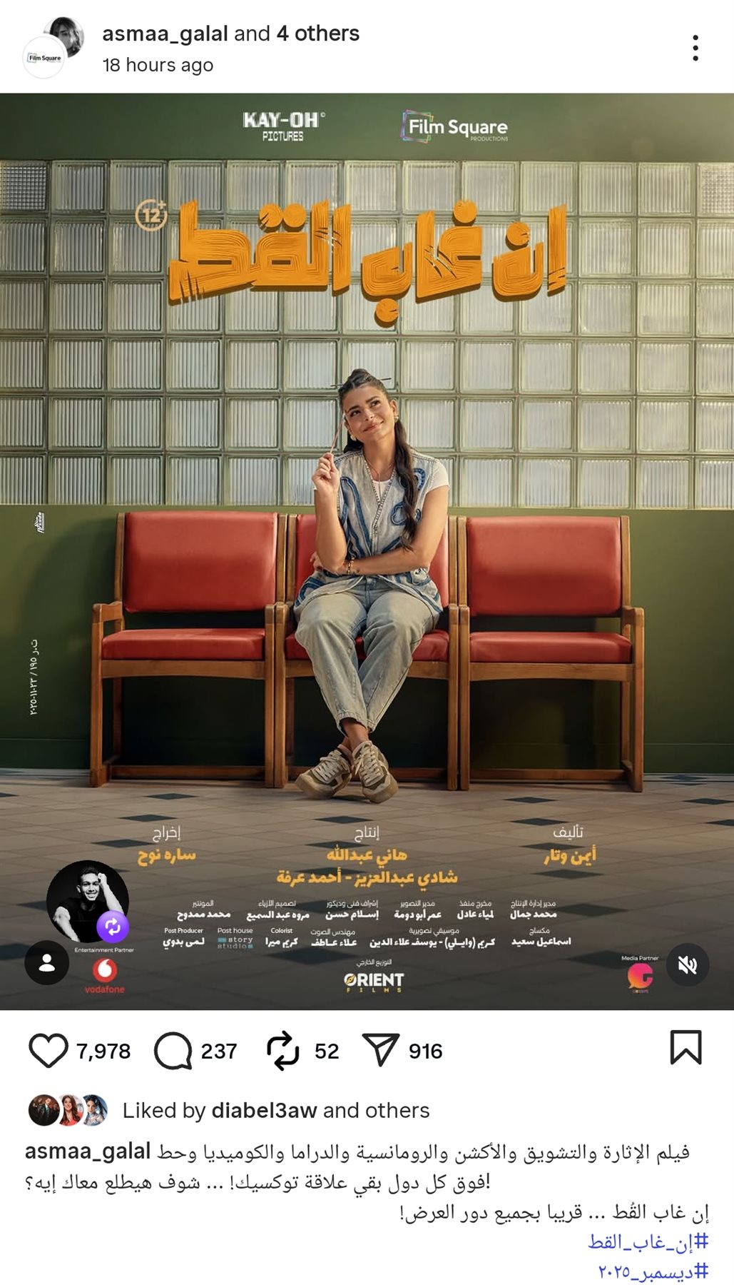 روجت الفنانة أسماء جلال لـ فيلم إن غاب القط، الذي تتعاون في بطولته بجانب الفنان آسر ياسين، والذي تستعد لعرضه خلال الشهر الجاري في دور العرض السينمائي المصري.